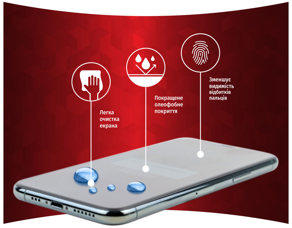 - Олеофобное покрытие. Обладает водоотталкивающими, жиростойкими и антикоррозионными свойствами. Уменьшает видимость отпечатков пальцев и позволяет легко чистить экран.