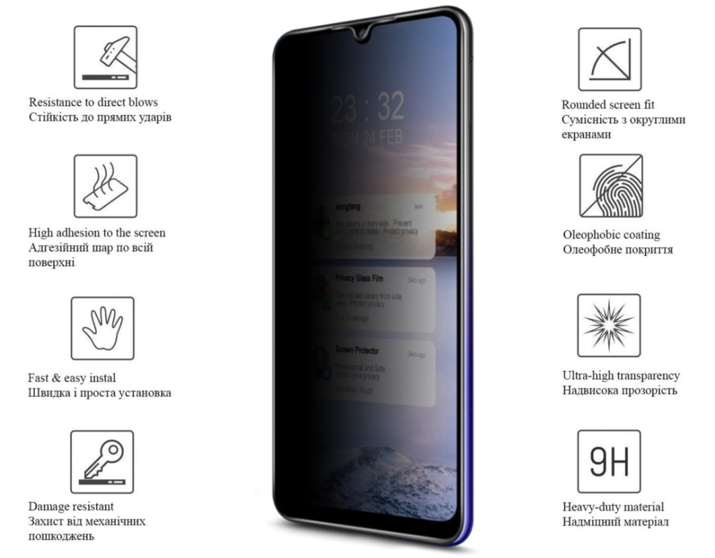 | Защитное стекло Drobak Anti Spy для экрана гораздо эффективнее обычных защитных стекол, так как оно изготовлено из специально обработанного закаленного стекла. Стекло защищает экран от царапин, даже при контакте с острыми металлическими предметами. Кроме того, стекло так же защищает экран от ударов, так как устанавливая его на телефон, вы получаете двойной запас прочности экрана. Форма стекла полностью соответствует данной модели смартфона, а за счет своей жесткости легко устанавливается на экран. Для этого достаточно очистить экран от грязи, снять со стекла пленку, закрывающую клейкий слой, и ровно приложить стекло на экран телефона. Снимается стекло так же легко, поскольку клейкий слой изготовлен на основе силиконового покрытия и после снятия не оставляет следов. Данное защитное стекло имеет уникальное покрытие, с фильтром конфиденциальности, которое позволяет скрыть информацию на экране вашего устройства от посторонних. Благодаря этому покрытию, экран смартфона будет виден только под прямым углом, а при взгляде со стороны разглядеть на нем что-то, а тем более текст, будет невозможно. Очень полезно в общественном транспорте или среди большого количества людей, если вы не любите, когда кто-то наблюдает за происходящим на вашем смартфоне. Данный фильтр имеет небольшой недостаток: он снижает яркость экрана. Поэтому сразу после установки стекла вам, возможно, захочется вручную выставить ее побольше. После нескольких дней привыкается и становится комфортно. Особенности: