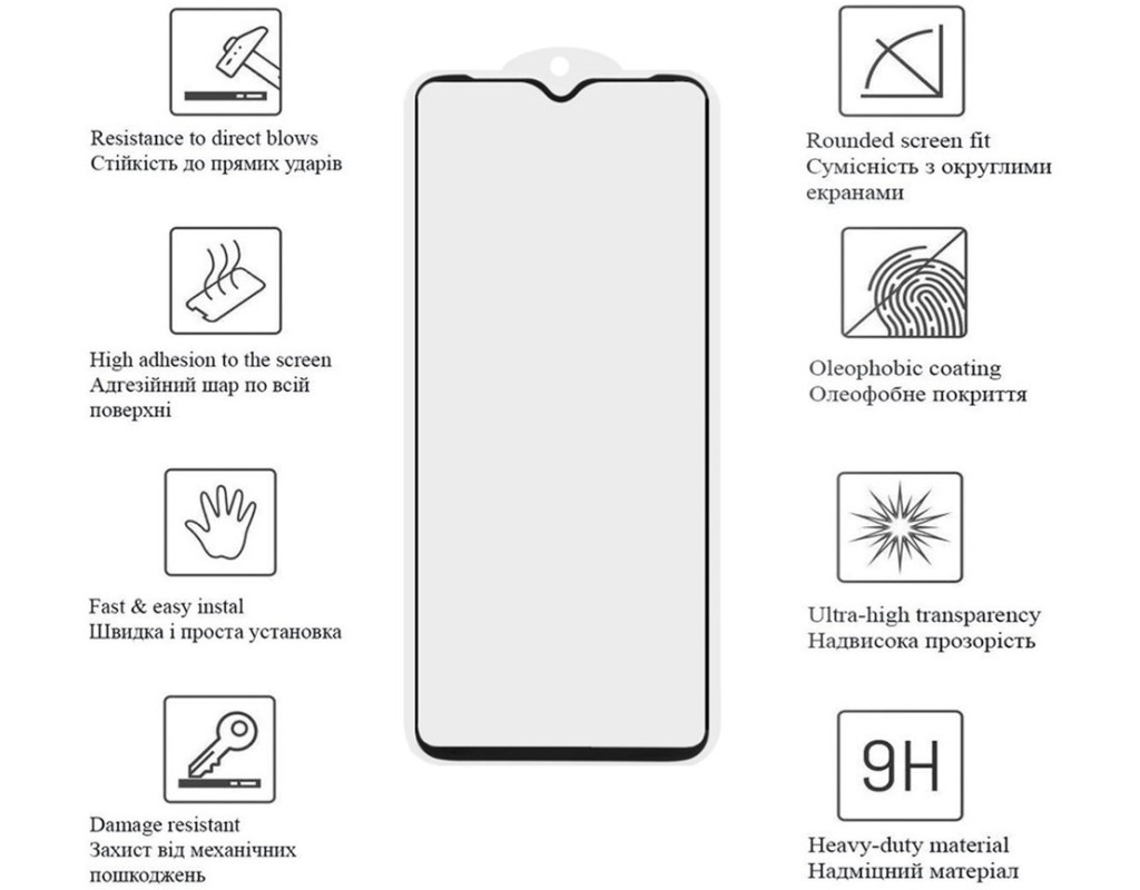 Защитное стекло Drobak Frame A+ Full Glue – это новое высокоэффективное решение для защиты экрана вашего смартфона от царапин, трещин и сколов, изготовлено из инновационного закаленного стекла, очень прочное, чтобы защитить экран телефона при падении на асфальт, при бытовых ударах, при взаимодействии с царапающими предметами (ключи, песок, лезвие ножа, гвозди). Инновационное закаленное стекло проходит несколько этапов специальной термообработки. В то же время, защитное стекло Drobak достаточно тонкое и практически незаметное на экране. Совершенно не влияет на чувствительность сенсора смартфона. Особая форма стекла выполнена в соответствии с особенностями смартфона. Защитное стекло Drobak Frame A+ Full Glue легко наклеивается в "домашних условиях". Защитное стекло Drobak Frame A+ Full Glue — это качественный, практичный в использовании аксессуар, который поможет избежать дорогостоящей процедуры замены экрана смартфона, сохранит дисплею его первоначальный внешний вид. Особенности стекла: