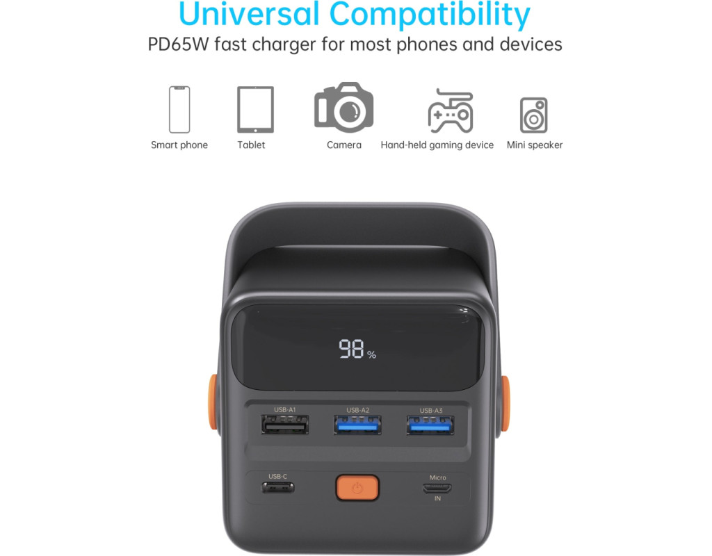 Этот Power Bank емкостью 50000 мА*ч предназначен для подзарядки портативного устройства. Он может похвастаться аккумулятором высокой плотности энергии, двумя входными портами (Micro USB и Type-C) и четырьмя выходными портами, чтобы все ваши устройства были заряжены, пока вы в пути. Вы также можете заряжать несколько устройств одновременно.