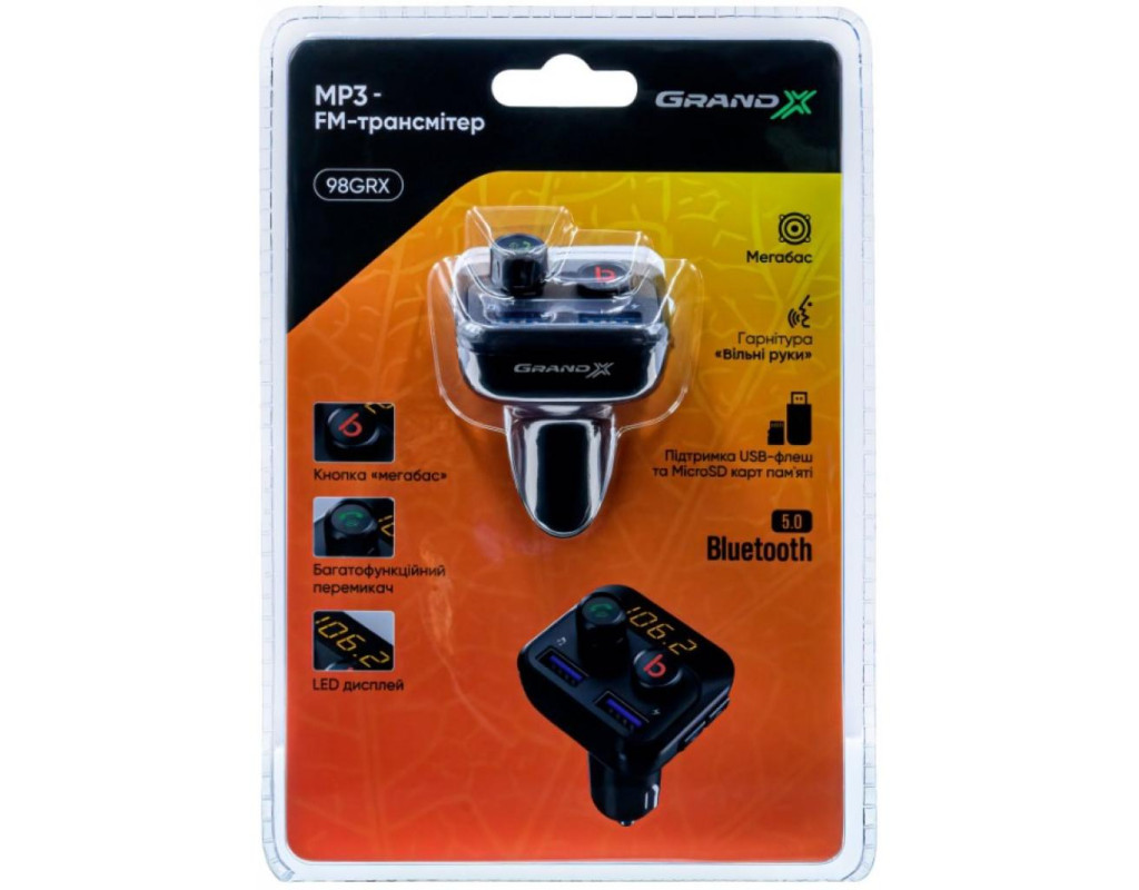 FM-трансмиттер Grand-X 98GRX предназначен для прослушивания музыкальных композиций в транспортном средстве. Основа работы устройства состоит в преобразовании файлов с USB-накопителя, карты памяти, смартфона или планшета на радиоволну, на которую следует настроит личный радиоприемник. Звук распространяется на небольшое расстояние. FM-трансмиттер — хорошая альтернатива, когда нет возможности приобрести магнитолу. Форматы воспроизведения: MP3, WMA, WAV, FLAC. Предназначено устройство для использования в транспортных средствах с питанием бортовой сети 12-24 B. |