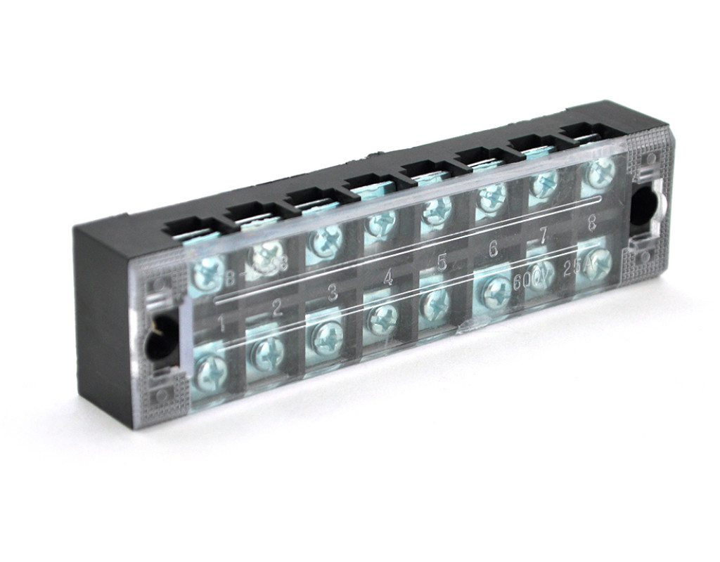 | Клемна колодка TB-2508 Напруга: 600В Струм: 25 A Кількість контактів: 8 Клемми: біметал Перетин проволоки: 0.5-2,5мм2 Колір: чорний |