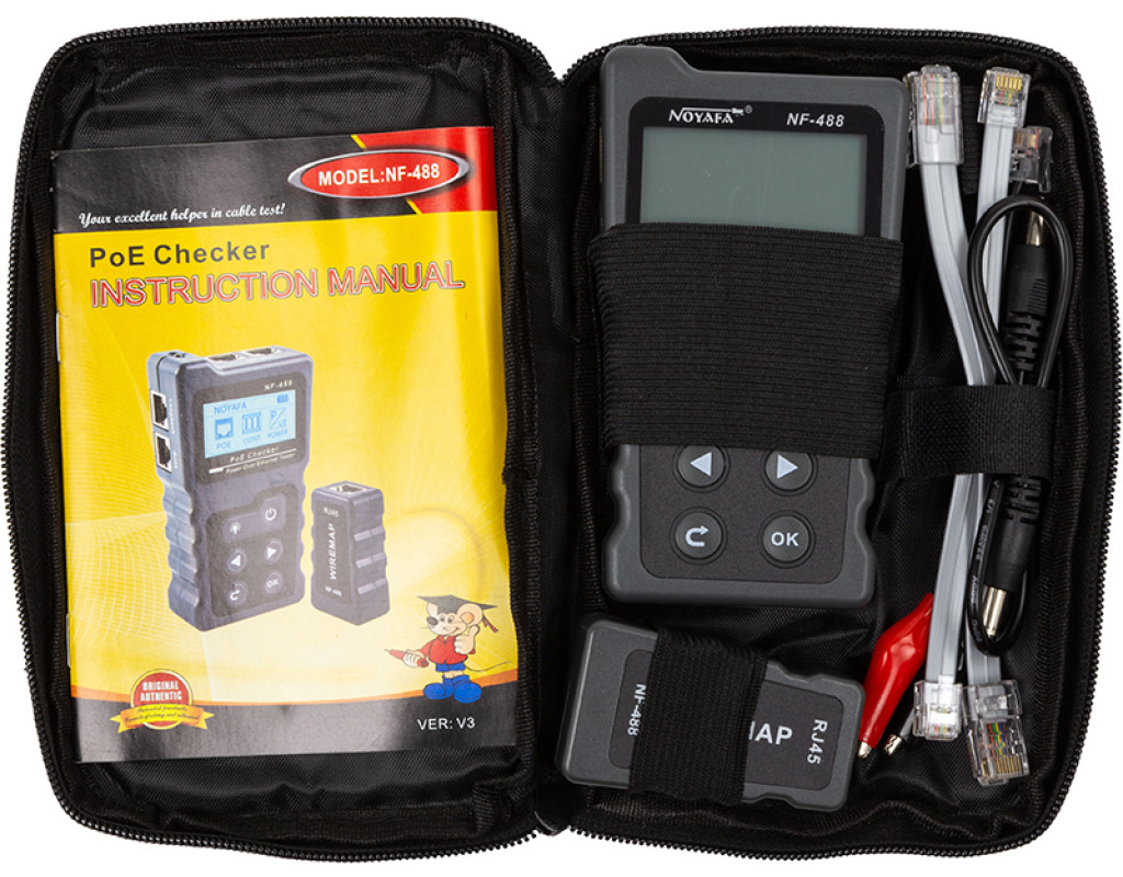 Сетевой кабельный PoE тестер HiSmart. Особенности: Сетевой тестер с большим выбором возможностей позволяет использовать устройство при тестировании POE оборудования, идентификации стандарта POE, есть функция проверки мощности, тестирование разводки кабеля. Состоит из дистанционного датчика и основного устройства - передатчика. На корпусе передатчика расположены разъемы для проверки качества кабеля Ethernet на отсутствие обрывов, короткого замыкания. Порт Loopback отвечает за проверку исправности сетевого кабеля, подключенного к коммутатору. Встроенная подсветка облегчает работу в помещении с плохим освещением. Функции: Функция PoE: проверка переключателя PoE DC5-60V, проверка мощности PoE в диапазоне 0-18W, определение типа питания PoE 802.3af/at. Сканирование целостности кабеля STP/UTP: проверка обрыва, короткого замыкания на расстоянии до 600 м., проверка качества Ethernet-кабеля. Функция питания: оценка энергопотребления, проверка напряжения и тока между адаптером питания и включенным устройством. Loopback - проверка отклика коммутатора на сигнал, посылаемый тестером. Характеристики: