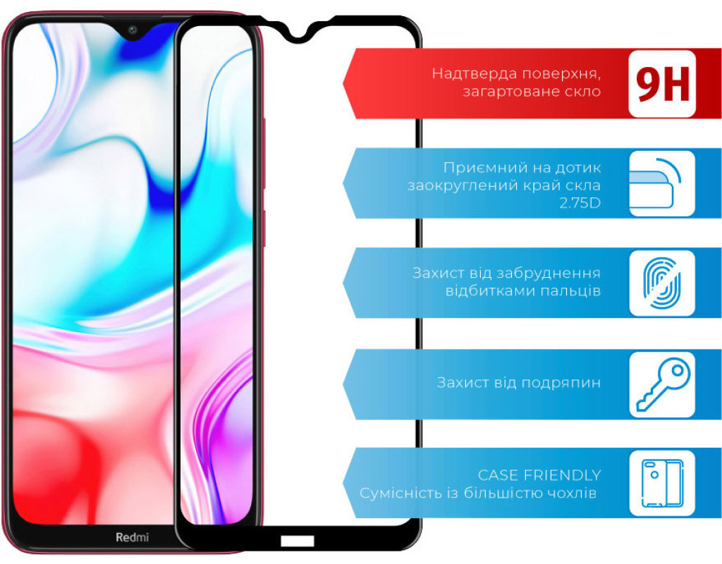 Назначение - для телефона, Вид покрытия - защитное, Совместимость с моделями - Xiaomi Redmi 8, Особенности - прочность: 9Н, влажная салфетка, Количество в упаковке - 1 шт