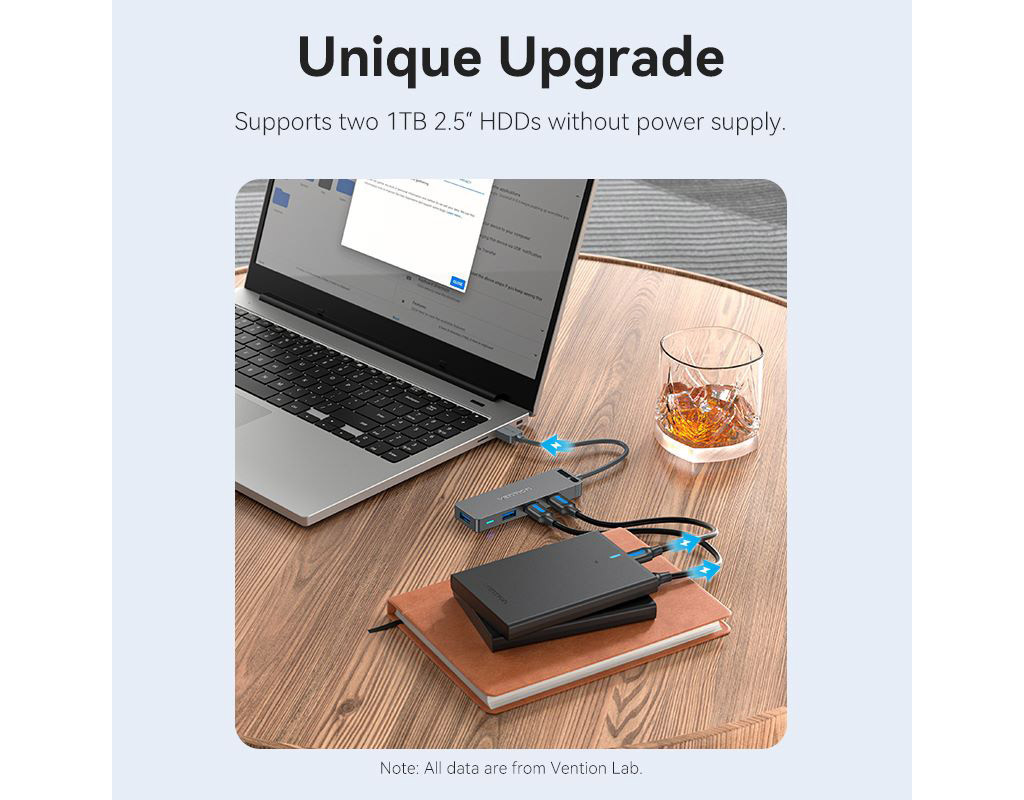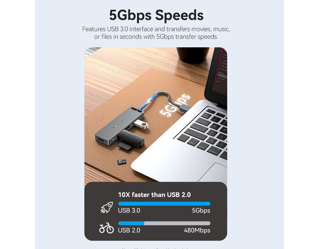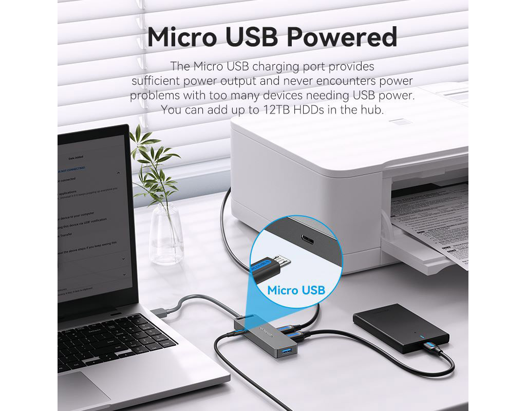 USB хаб Vention позволит владельцам ноутбуков расширить количество доступных разъемов высокоскоростного интерфейса USB 3.0, со скоростью передачи данных до 5 Гбит/с. Хаб Vention позволяет одновременно подключить до четырех устройств с одинаковыми или разными интерфейсами: USB 3.0, USB 2.0, USB 1.1. Вы сможете подключить через него: USB мышь и клавиатуру, USB-флешки, внешний жесткий диск HDD или SSD, видеокамеру, принтер, сканер и другие устройства. Питание адаптера обеспечивается по шине USB, однако для подключения энергоемких устройств, таких как HDD необходимо подключать дополнительное питание, через порт microUSB, расположенный на корпусе хаба. Поддерживает функцию Plug-and-Play и не требует установки драйверов. Работает по технологии OTG. Технические характеристики: