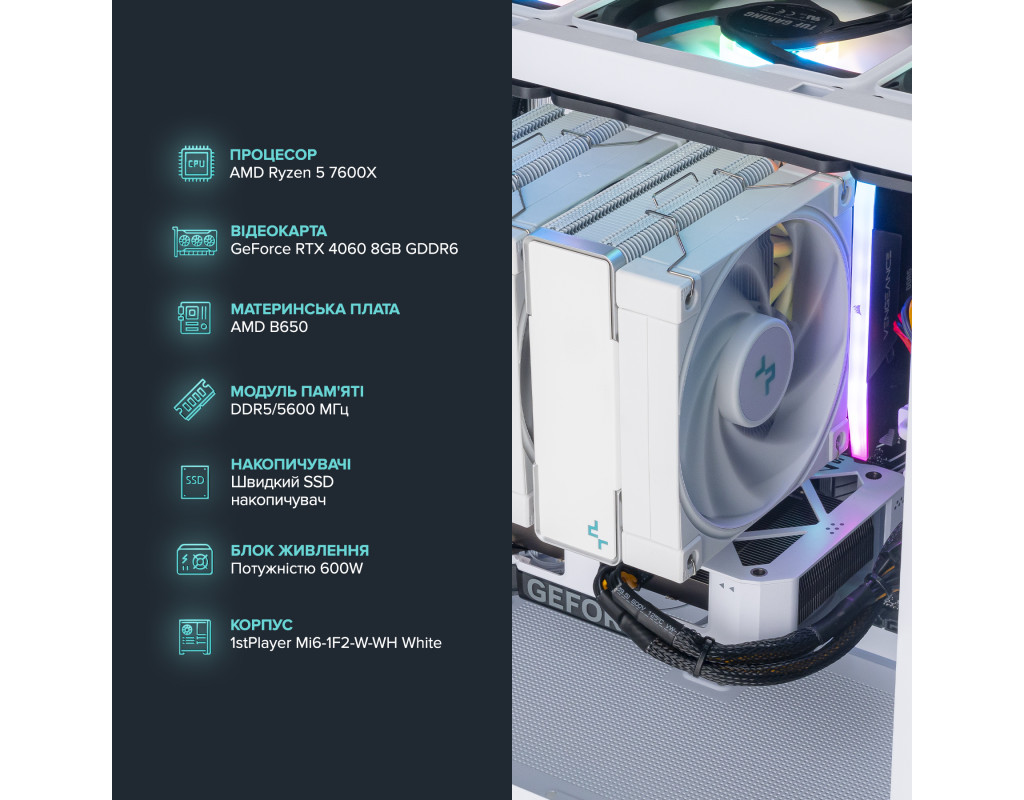 Персональный компьютер ASGARD Fenrir (A76.64.S10.46.3456); AMD Ryzen 5 7600X (4.7 - 5.3 ГГц) / ОЗУ 64 ГБ / SSD 1 ТБ / NVIDIA GeForce RTX 4060 8 ГБ / без ОП / LAN / Wi-Fi / Bluetooth / Ubuntu / белый