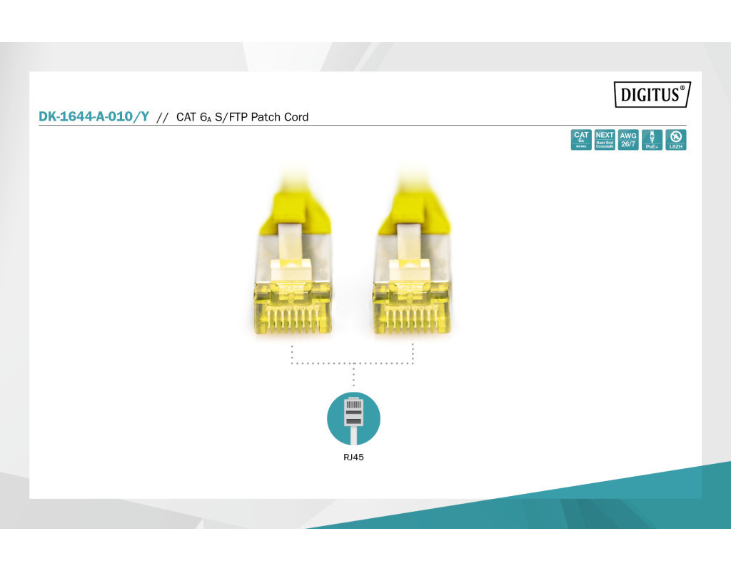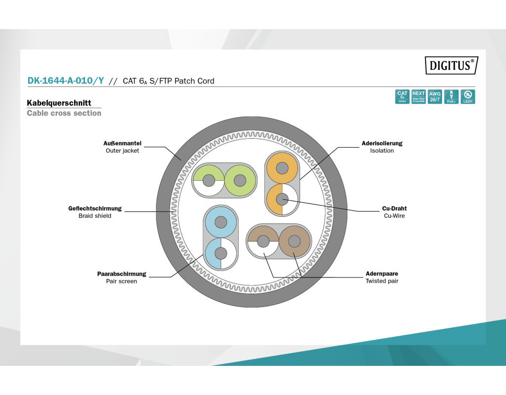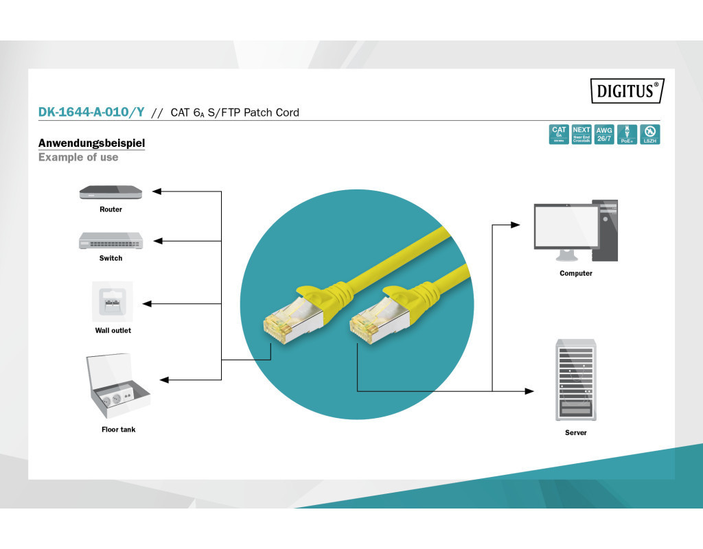 | Патч-корды DIGITUS® категории 6A класса EA изготовлены и протестированы в соответствии со спецификациями ISO/IEC 11801 и DIN EN 50173 категории 6 A. Они гарантируют, что установленная кабельная система отвечает требованиям спецификации каналов ISO и EN и обеспечит оптимальный уровень производительности кабеля DIGITUS® 6A |