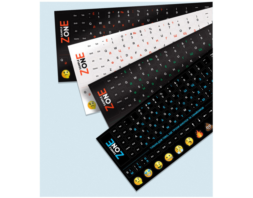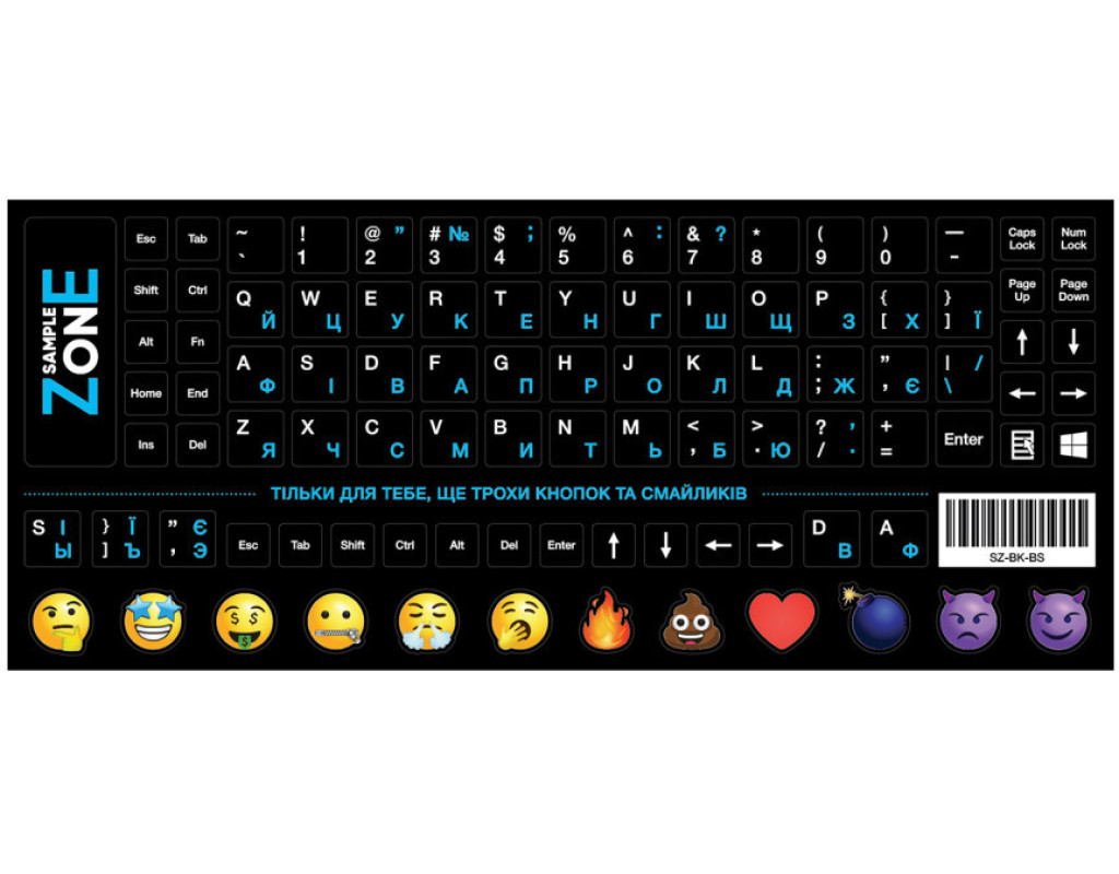 Наклейка на клавиатуру SampleZone черная, бело-синяя (SZ-BK-BS) Наклейки на клавиатуру, черные, бело-синие буквы. Изготовлены по специальной технологии, которая предотвращает стирание букв. Имеет приятную на ощупь поверхность, при наклеивании схожи с пластиковой поверхностью клавиатуры. Высококачественная ультрафиолетовая печать обеспечивает четкое отображение раскладки клавиатуры. Не стираются и не изменяют форму при длительном использовании. Имеет дополнительный набор букв и смайликов. Раскладка: русский/украинский/английский Наклейки на клавиатуру SampleZone: - Наклейки изготовлены из мягкой ПВХ пленки, что делает наклейки почти незаметными на клавиатуре и создают вид оригинальных букв. |
