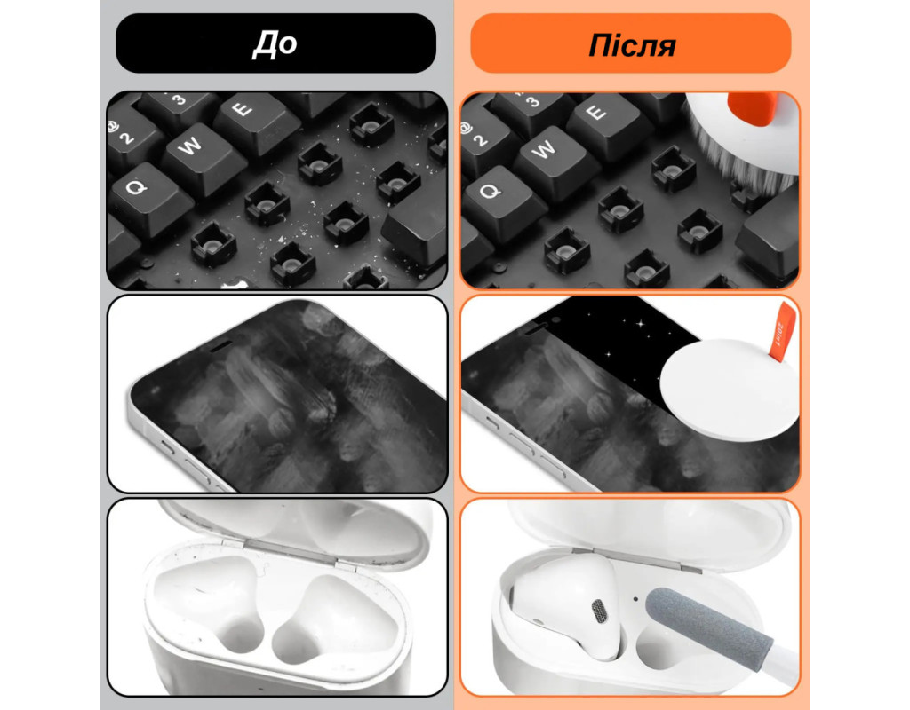 | Набор XoKo Clean set 1000 20 в 1 изготовлен для удаления пыли, мелкого мусора и других загрязнений из беспроводных наушников, футляра для зарядки наушников, смартфонов, планшетов, пультов дистанционного управления, другого цифрового оборудования и сложных участков. Универсальный компактный набор для чистки 20 предметов в 1 – со специальным спреем и волокном для экранов, съемниками для клавиатуры, с разного рода мягкими и жесткими кисточками, скрепками для SIM-карт, пинцетом, щеточкой для чистки наушников и фото/видео линз объектов. Чаще всего применяется для чистки: наушников, клавиатур, экранов, телефонов, мониторов, ноутбуков, фото- и видеоаппаратуры. Особенности такого набора: