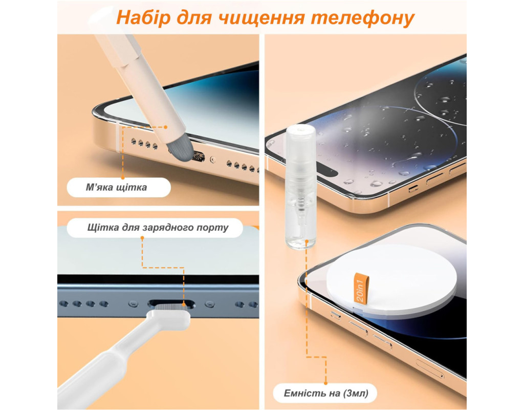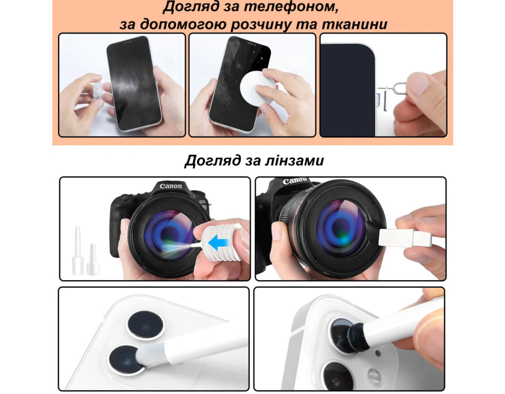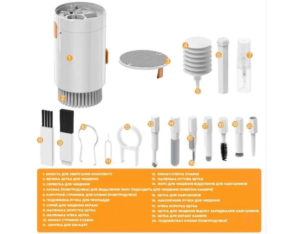Что входит в набор? Этот набор 20-в-1 включает в себя все что вам нужно чтобы почистить гаджеты в доме. 1. Емкость для хранения комплекта 2. Большая щетка для чистки 3. Салфетка для чистки 4. Клизма (воздуходувка) для удаления пыли (подходит для чистки поверхности камеры) 5. Короткий стержень для клизмы (воздуходувки) 6. Удлиненная ручка для принадлежностей 7. Спрей для чистки экрана 8. Маленькая жесткая щетка 9. Маленькая мягкая щетка 10. Съемник стержня клавиш 11. Скрепка для SIM-карт 12. Съемник ключа клавиш 13. Маленькая угловая щетка 14. Ворс для чистки отделения для наушников 15. Щетка для наушников 16. Наконечник чистящей ручки 17. Мягкая короткая щетка 18. Щетка для чистки отсека зарядки наушников 19. Щетка для экрана камеры 20. Удлинитель клизмы (воздуродувки) |