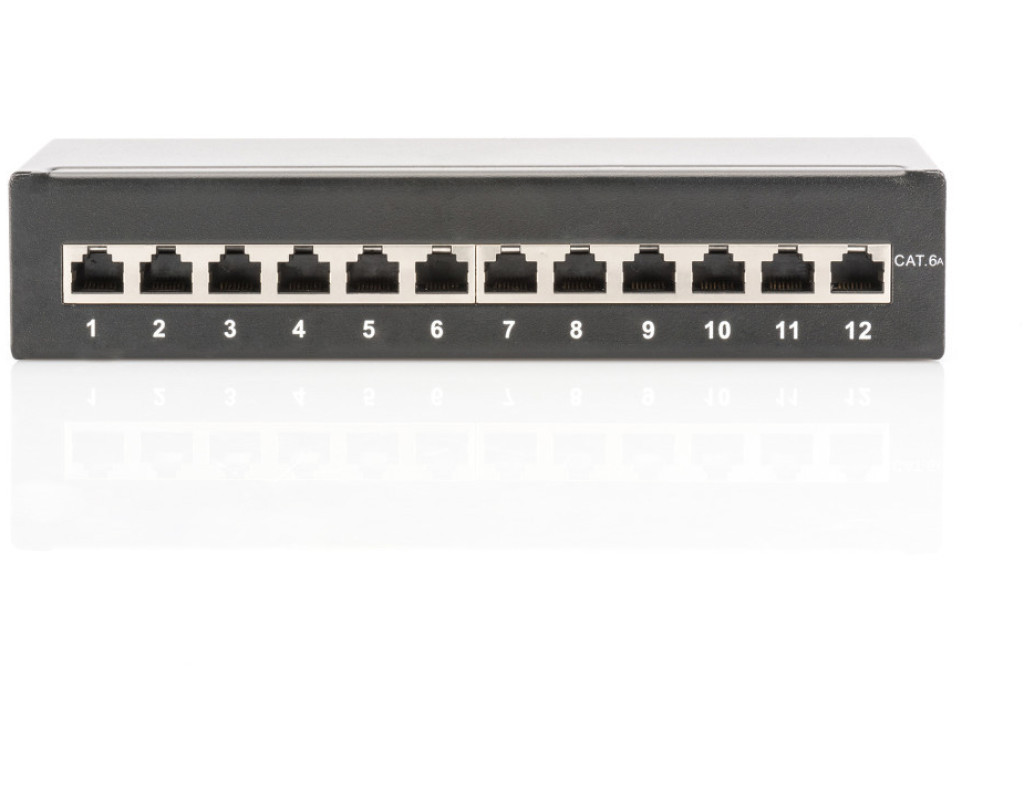 DIGITUS (DN-91612SD-EA) настольная патч-панель CAT 6A, экранированная. Применяется в решениях для дома/малого офиса. Подключение кабеля с помощью зажимов LSA, цветовая кодировка в соответствии с EIA/TIA 568 A&B. Основные параметры Область применения: до 500 МГц; 10GBase-T Нормы: