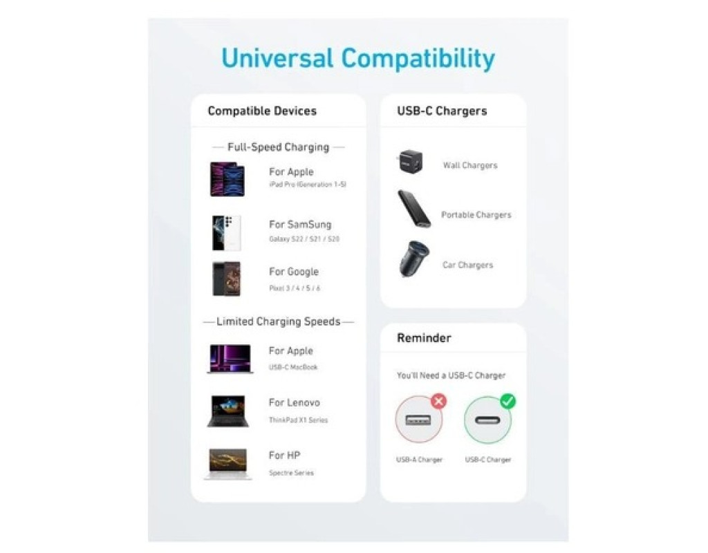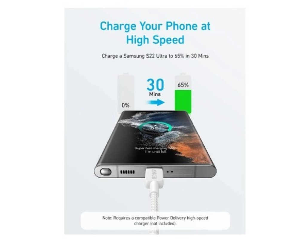 Зарядите Samsung S23 до 55% всего за 30 минут, если подключите его к совместимому зарядному устройству Power Delivery (зарядное устройство не входит в комплект). Созданный быть выносливым Подтверждены строгими лабораторными тестами, что выдерживает до 12 000 гибок. Надежная зарядка Сертифицированный кабель для безопасной и надежной зарядки практически любого устройства USB-C. |