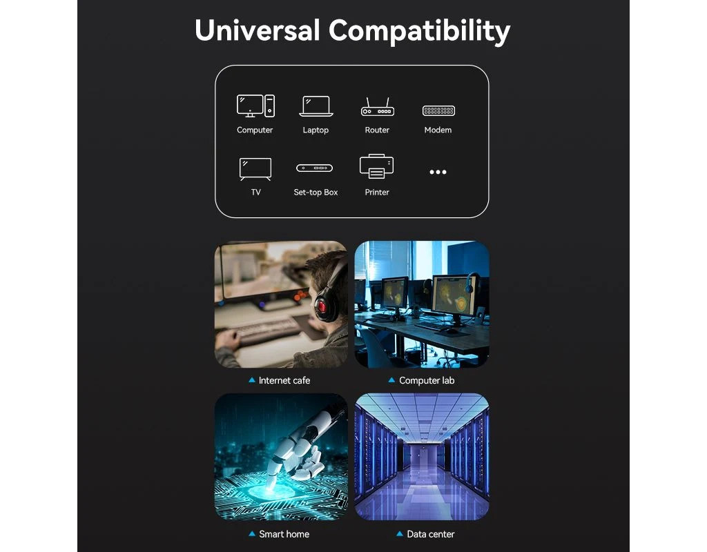 Сетевой кабель Vention Ethernet RJ45 САТ 8 предназначен для коммутации компьютерных Ethernet-сетей со стандартами 10ВАSE-Т (10 Мбит/с), 100ВАСЕ-Т(х) (100 Мбит/с), 1000ВАСЕ-Т(х) (1 Гбит /с), 10GBASE-Т (10 Гбит/с), 40GBASE-Т (40 Гбит/с).