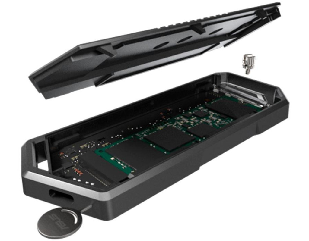 | Контейнер для NVMe-накопителей ROG Strix Arion (ESD-S1C): интерфейс USB 3.2 Gen2 Type-C (10 Гбит/с), два кабеля (USB-C -> C и USB-C -> A), установка накопителя без инструментов, термопрокладки в комплекте, совместимость с PCIe-устройствами форм-факторов 2280/2260/2242/2230 (ключ M или B+M).