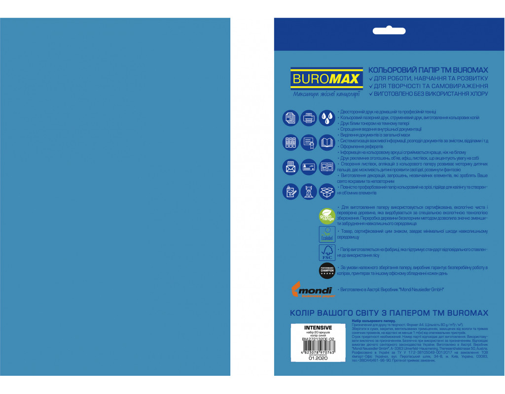 Бумага Buromax А4, 80g, INTENSIVE blue, 20sh, EUROMAX (BM.2721320E-02)