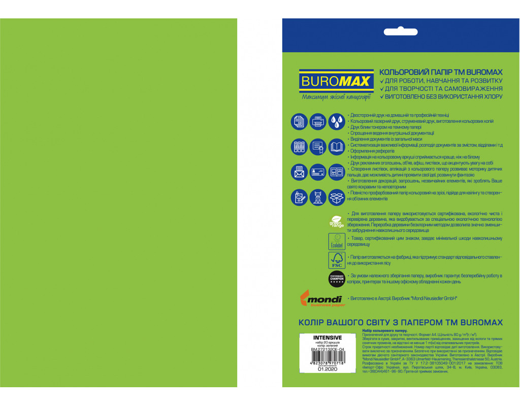 Бумага Buromax А4, 80g, INTENSIVE green, 20sh, EUROMAX (BM.2721320E-04)