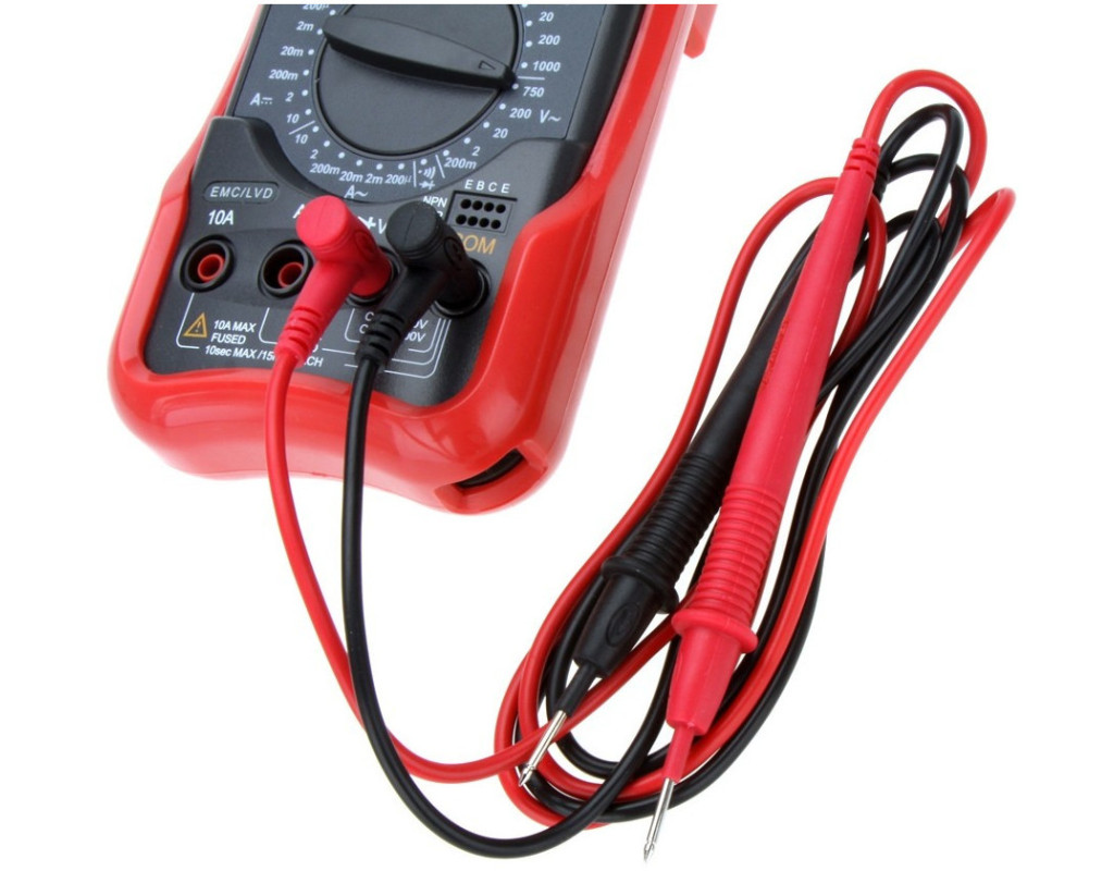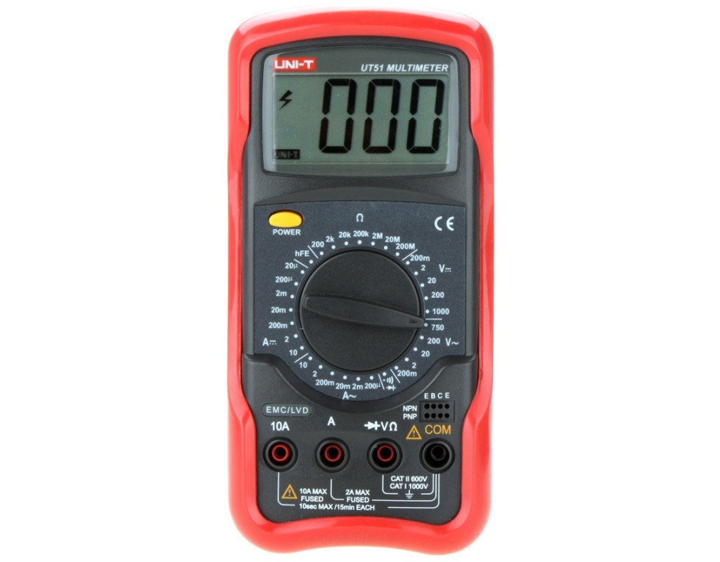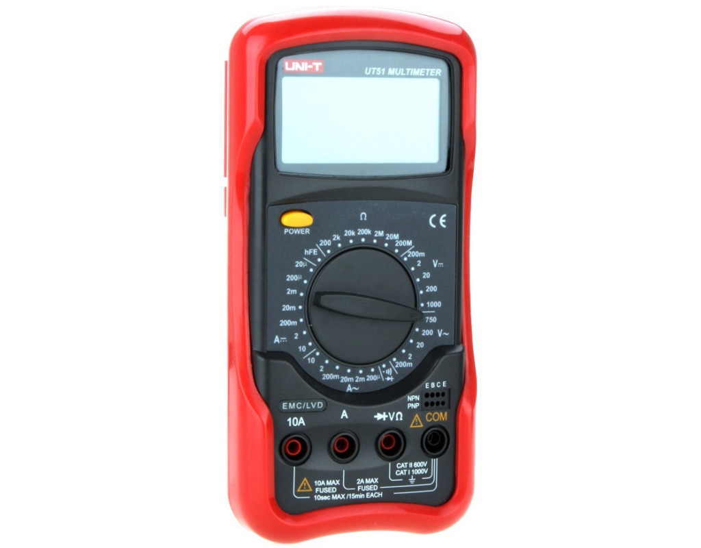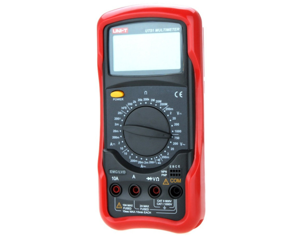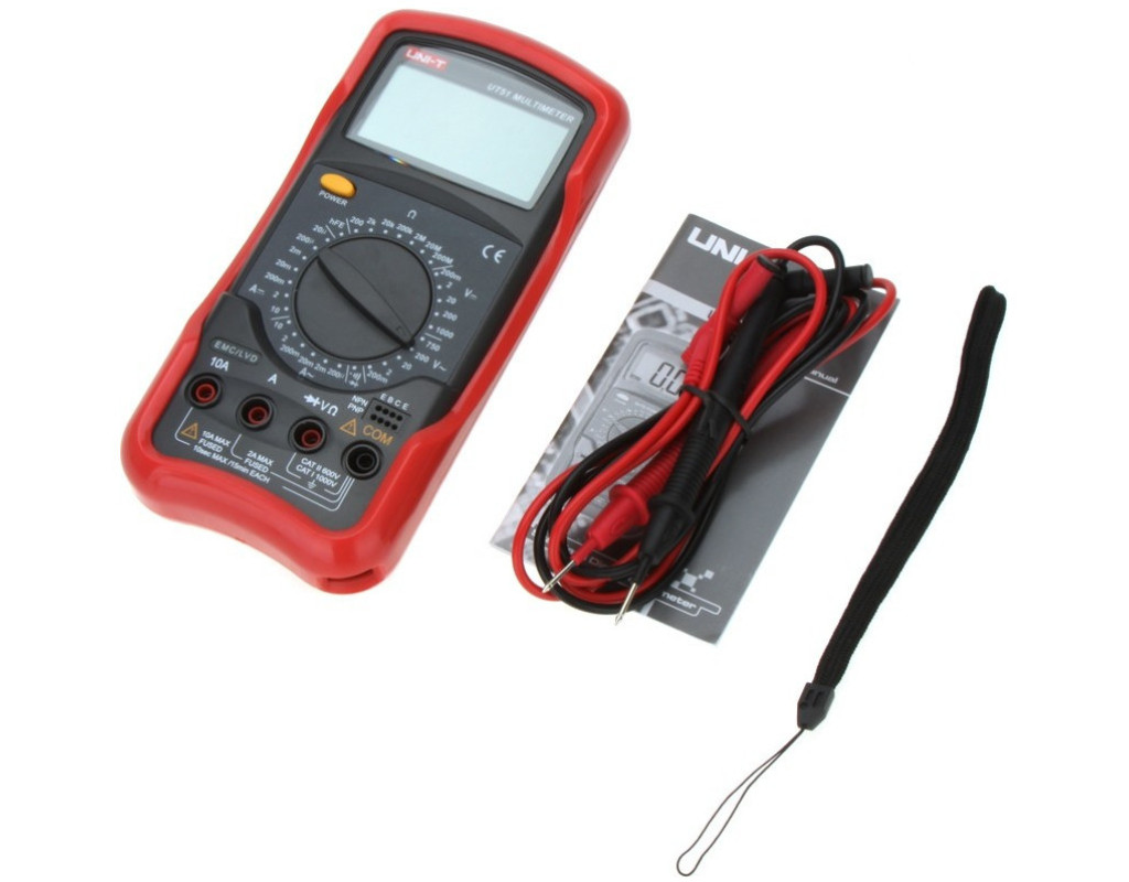 Мультиметр UT51 – универсальный измерительный прибор от надежного производителя UNI-T. Измеряет все основные параметры. Сопротивление до 200 МОм. Имеет полимерный противоударный чехол. Отличное сочетание цены и функциональности. Простой и надежный недорогой прибор. Особенность мультиметра UNI-T UT51КонструкцияUNI-T UT51 представляет собой устройство классической формы. На передней панели мультиметра расположен большой дисплей. Ручной переключатель режимов измерений занял центральное место прибора. Слева от него находится кнопка включения питания. В самой нижней части устройства разместились отверстия для подключения щупов и разъем для проверки диодов и транзисторов. Высокая прочность и надежностьМультиметр UT51 изготовлен из качественного пластика, облаченного в защитный чехол из прорезиненного протовоударного материала. Производитель заявляет, что данная модель не боится падения с высоты 1.5 м. Благодаря ему также мультиметр не выскользнет из рук. Измерения Мультиметр UNI-T UT51Прибор способен работать со всеми основными величинами. А именно: Кроме того, данная модель обладает традиционными для мультиметров функциями такими как тестирование диодов и проверка коэффициента усиления транзисторов. Для работы с последней величиной предусмотрен отдельный разъем. Проверить целостность электрической цепи можно воспользовавшись функцией прозвонка. ПитаниеПитание мультиметра UNI-T UT51 осуществляется от батареи 9 В, типа "Крона". Модель батарейки достаточно популярна, поэтому у вас не возникнет проблем в ее поиске. Вы всегда сможете найти любой элемент питания на страницах магазина Electronoff. Функция автоматического отключенияЧтобы постоянно не думать об отключении прибора, если вы отвлеклись на другие задачи, в данной модели предусмотрено наличие функции автоматического отключения: питание устройства автоматически отключается при длительном бездействии, что экономит заряд батареи. В любое время вы можете купить мультиметр UNI-T UT51 в магазине Electronoff. Специалисты компании всегда готовы помочь выбрать измерительные приборы, оказав профессиональную консультацию. Широкий ассортимент товаров нашего интернет-магазина, а также лучшая цена на мультиметр, не оставят вас равнодушными. Если вы житель столицы – наши курьеры могут доставить покупки в день заказа. Для жителей других городов мы предлагаем быструю доставку по Украине почтовыми сервисами. На всю продукцию распространяется расширенная гарантия и послегарантийный сервис. Технические характеристики мультиметра UNI-T UT51: |