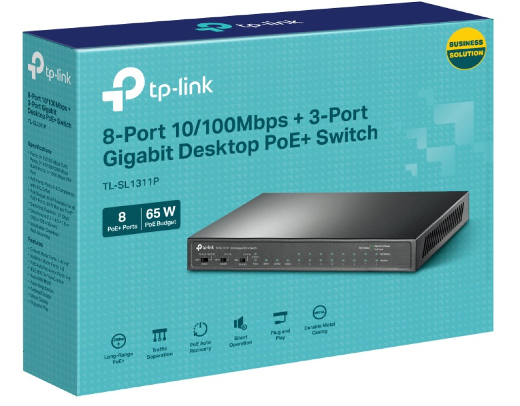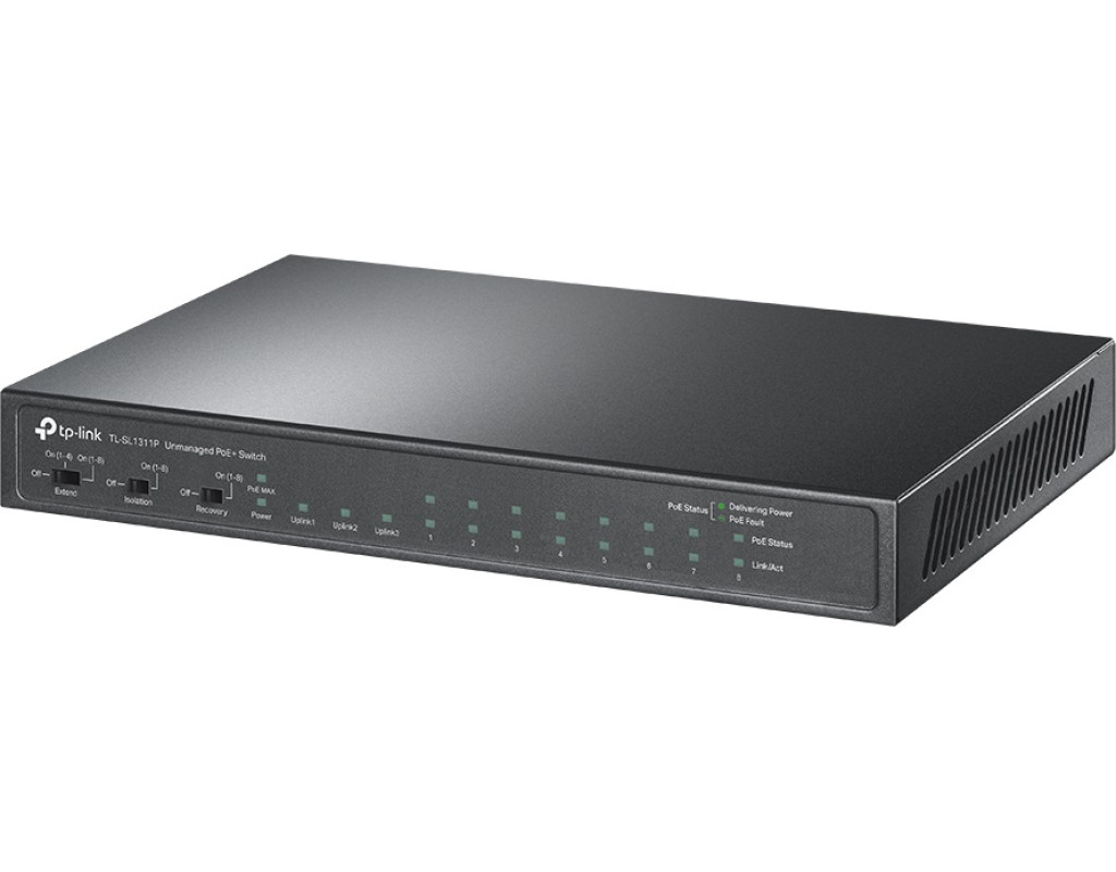 | TL-SL1311P - это неуправляемый коммутатор с 8 портами 10/100 Мбит/с, 2 портами 1000 Мбит/с и 1 слотом SFP, который не требует настройки и обеспечивает 8 портов PoE (Power over Ethernet). Он может автоматически обнаруживать и подавать питание на все устройства питания (PD), совместимые со стандартом IEEE 802.3af/at. В этой ситуации электроэнергия передается вместе с данными по одному кабелю, что позволяет расширить сеть там, где нет линий электропередач или розеток, где необходимо закрепить такие устройства, как точки доступа, IP-камеры или IP-телефоны и т.д.