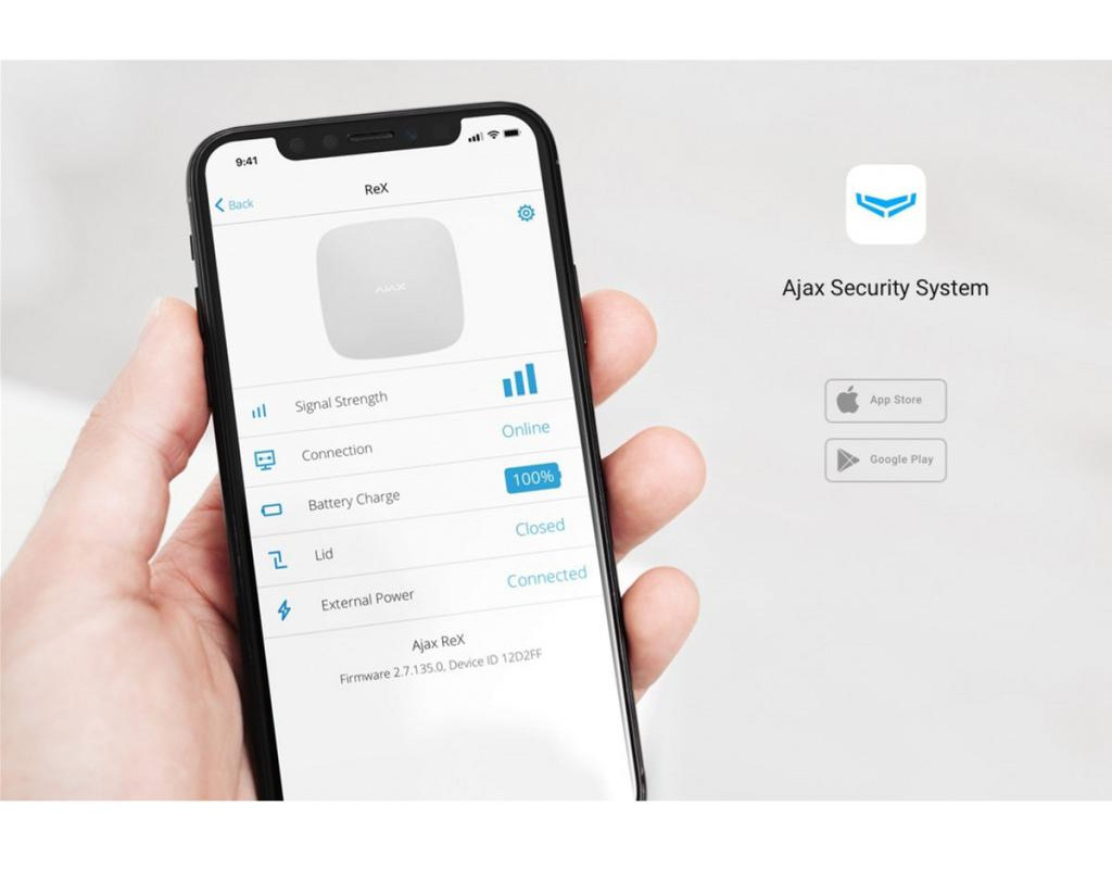 ReX — увеличивает дальность действия всех устройств системы безопасности Ajax. Безопасность больших объектов ReX расширяет границы охраняемой зоны. Ретранслятор управляет подключенными к нему устройствами системы, позволяя разместить их на значительном удалении от хаба: в многоэтажном офисе, в отдельно стоящем гараже или на большом производстве. С ReX площадь покрытия радиосети Ajax может быть увеличена до 16 км². - Увеличивает площадь покрытия системы до 16 км²