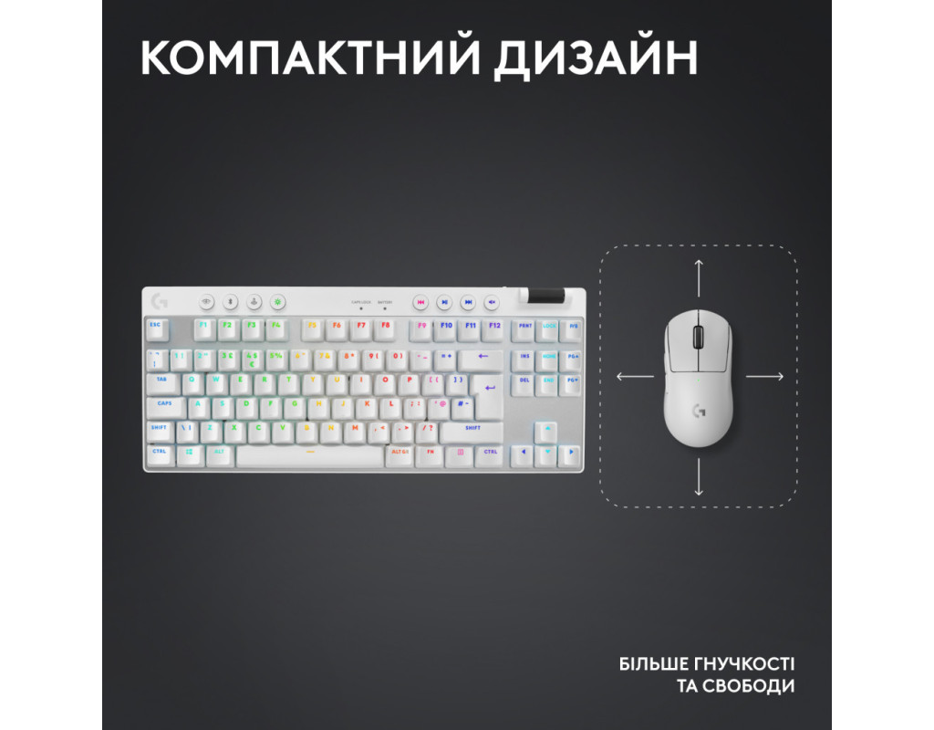 | Клавиатура Logitech G PRO X TKL Lightspeed Tactile USB UA White (920-012148) — это уникальное сочетание инновационных технологий и высокого качества, что делает её идеальным выбором для самых требовательных игроков. Разработанная совместно с лучшими киберспортсменами мира, она готова дарить победы на чемпионатах. Одна из самых ярких особенностей этой клавиатуры — её беспроводное подключение через технологию LIGHTSPEED, которая обеспечивает минимальные задержки сигнала и стабильную работу без разрывов. Благодаря поддержке Bluetooth и USB адаптера 2.4 ГГц, вы можете выбрать оптимальный способ соединения, который лучше всего соответствует вашим потребностям. Механические переключатели GL Tactile, которыми оснащена клавиатура, обеспечивают быструю и точную реакцию на каждое нажатие. Эти переключатели отличаются своим тактильным откликом, что важно для геймеров, которым необходимо чувствовать момент активации клавиш при нажатии, но без лишнего шума. Клавиатура также оснащена RGB-подсветкой LIGHTSYNC, которая позволяет персонализировать внешний вид рабочего пространства, настраивая каждую клавишу отдельно или выбрав готовые профили подсветки. Это не просто визуальный элемент, а и средство повышения эффективности, позволяющее быстрее ориентироваться в управлении даже в темноте. Кроме того, Logitech G PRO X TKL включает программируемые клавиши и элементы управления мультимедиа, которые позволяют персонализировать контроль под игры или рабочие задачи. Благодаря функции блокировки клавиши Win, вы можете избежать случайных выходов на рабочий стол во время напряжённых игровых моментов. Компактный формат TKL и трёхраскладочная клавиатура (русская, английская, украинская) делают её удобной для использования, обеспечивая лёгкость в транспортировке и максимальную совместимость с разнообразными программами. Улучшенная память для сохранения ваших настроек и быстрый доступ ко всем функциям делают Logitech G PRO X TKL незаменимой для тех, кто ценит производительность и надёжность в каждой детали. Выбирая эту клавиатуру, вы получаете больше, чем просто инструмент для игры — это ваш надёжный партнёр в достижении побед. |