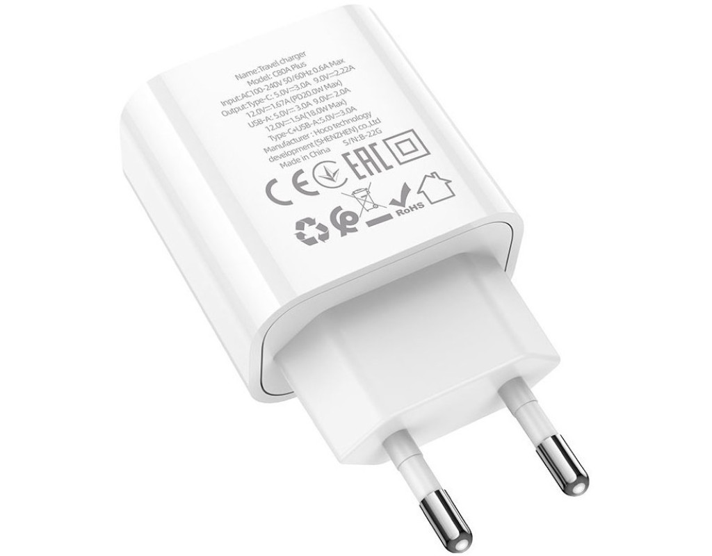 Універсальний зарядний пристрій Hoco C80A Plus Rapido 1xUSB-A, 1xUSB-C, PD20W, QC3.0 White – стильне та компактне, з високим функціоналом. Призначений для швидкого та безпечного підзарядки ваших гаджетів. Він підтримує технології швидкої зарядки QC3.0 та PD, має роз'єм USB та Type-C. Видає струм до 3A, потужність до 20W. Переваги: