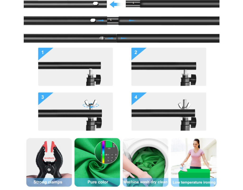 Особливості: 1. Легка опорна залізна металева конструкція забезпечує довговічність і портативність. 2. Регульована висота до 200 см, ви можете встановити правильне положення, яке вам потрібно. 3. Закріпіть секційні поперечини, поверніть ергономічну ручку на штативі, щоб встановити висоту та зафіксуйте її, можна легко встановити без інструментів і за лічені хвилини. 4. Знімні поперечини і складні стійки, які можна легко упакувати в сумку для зручного транспортування. Комплектація: 1. Поперечини х 3 шт. 2. Фон з поліефірної тканини червоного кольору 2x2 м x 1 шт. 3. Фон з поліефірної тканини синього кольору 2x2 м x 1 шт. 4. Фон з поліефірної тканини зеленого кольору 2x2 м x 1 шт. 5. Затискач (прищіпки) для фону x 3. 6. Стійка 200см x 2. 7. Фіксатор x 6. 8. Сумка для транспортування x 1. Вага: 3.3 кг. Розмір в упаковці: 880х220х215 мм. Вага в упаковці: 4 кг. |