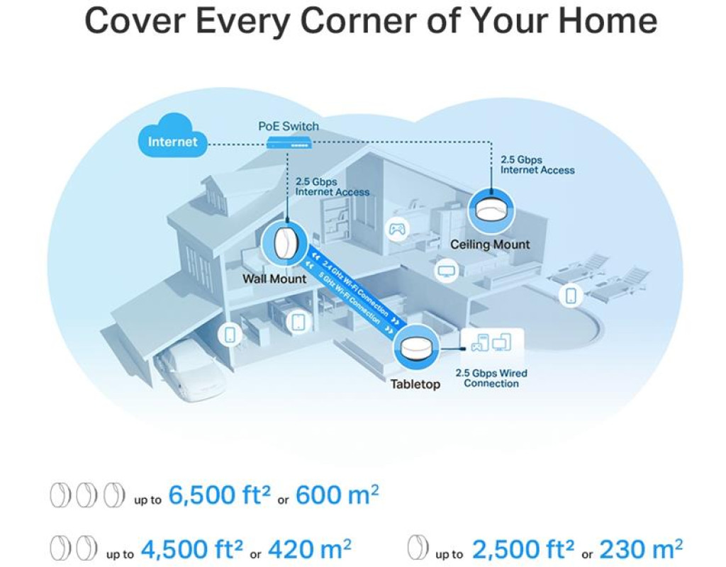 Несколько вариантов установки – разместите его на столе или установите на потолке или стене с помощью адаптивных аксессуаров. Поддерживается PoE – Питание через Ethernet для упрощенного развертывания сети. Проводная сеть Multi-Gig 2,5 Гбит/с – 1х Порт 2,5 Гбит/с + 1х Гигабитный порт. Бесшовная Mesh сеть на основе искусственного интеллекта – Интеллектуально изучает вашу сетевую среду, чтобы обеспечить идеальный Wi-Fi, уникальный для вашего дома. TP-Link HomeShield – обеспечивает полную защиту сети, надежный родительский контроль и безопасность IoT приборов в реальном времени. Универсальная совместимость – обратная совместимость со всеми поколениями Wi-Fi и работает с любым поставщиком услуг Интернета (ISP) и модемом. Настройка проще, чем когда-либо – Программа Deco шаг за шагом проведет вас через настройки. |