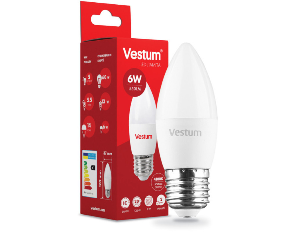Светодиодная лампа Vestum 1-VS-1301 мощностью 6 Вт дает 550 лм. Потребляя в разы меньше электричества, чем лампы накаливания или люминесцентные лампы, оно дает такое же количество света и прослужит в несколько раз дольше.