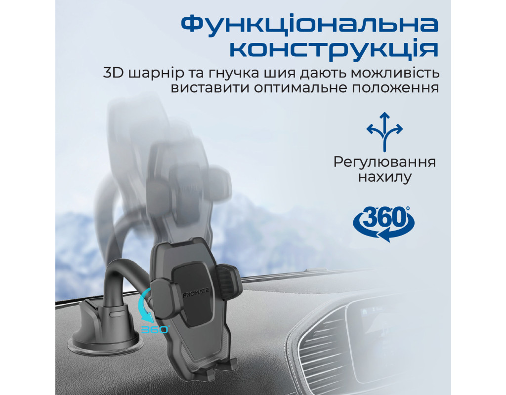 | Promate DashMount - компактный и легкий автодержатель на присоске, с механическими зажимами. Обеспечить надежную фиксацию любых устройств с шириной от 5 до 9.5 сантиметров.