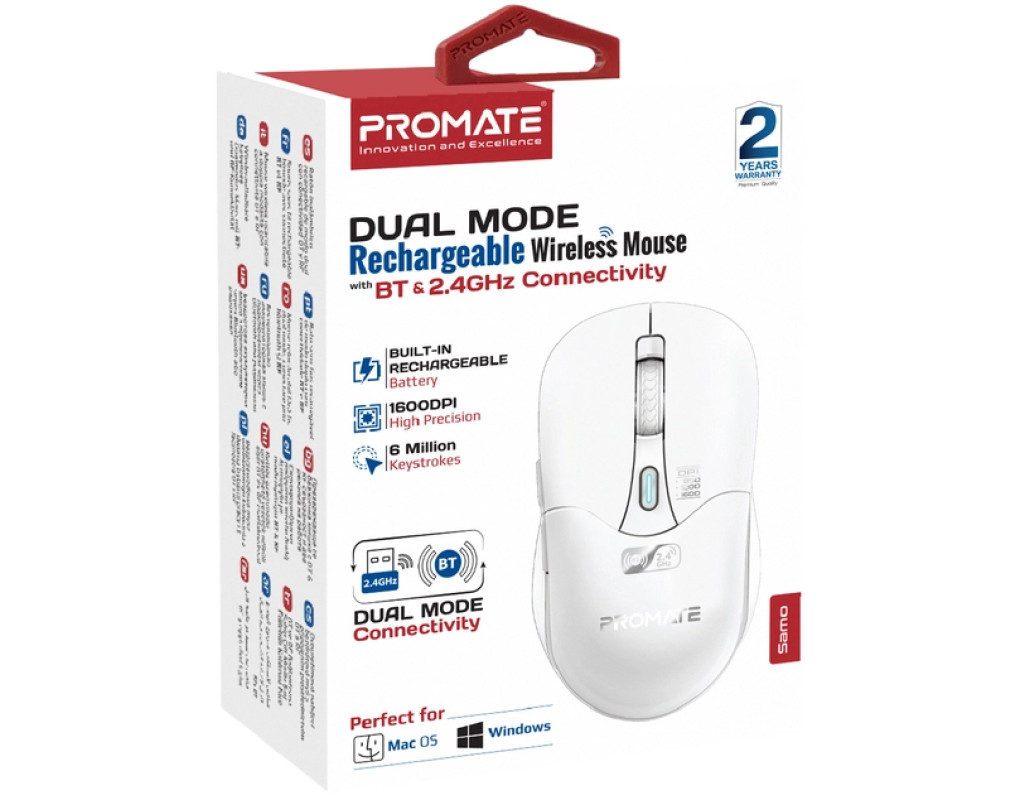 | Мышка Promate Samo Wireless/Bluetooth White (samo.white) — это изящный пример инновационного подхода к беспроводным мышкам. Она создана для тех, кто ценит комфорт и отличную производительность. Благодаря своему эргономичному дизайну, мышка идеально повторяет контуры вашей ладони, обеспечивая уверенный захват и максимально точное управление. Подключение к мышке стало проще благодаря двум вариантам: обычному Bluetooth и проверенному USB-адаптеру в диапазоне 2.4 ГГц, которые позволяют вам сохранять стабильное соединение при работе на расстоянии до 10 метров от вашего устройства. Ваша работа не будет ограничена рамками проводов, что делает Samo идеальным выбором для ноутбука, обеспечивая мобильность в любых условиях. Благодаря оптическому датчику с максимальным разрешением до 1600 dpi, вы сможете легко настраивать чувствительность курсора под свои потребности. Переключение между тремя уровнями чувствительности — 800, 1200 и 1600 dpi — происходит одним нажатием кнопки, позволяя быстро адаптироваться к любой ситуации, будь то точная графика или быстрый поиск информации в Интернете. Встроенный аккумулятор на 500 mAh обеспечивает до 70 часов непрерывной работы, а заряжается он всего за 2.5 часа при помощи комплектного кабеля USB-A/USB-C. Больше не нужно беспокоиться о частой замене батареек, так как мышка обеспечит вам бесперебойную работу на длительный срок. Функциональные боковые кнопки упрощают навигацию по веб-страницам и документам, добавляя удобства в ваш рабочий процесс. А благодаря прочной конструкции, мышка способна выдержать до 6 миллионов нажатий, что гарантирует долговечность и надежность. Благодаря своим компактным размерам (110 х 63 х 38 мм) и весу всего 146 г, эта мышка является идеальным компаньоном в поездках или командировках. Её стильный белый цвет добавляет элегантности и привлекательности к вашему рабочему месту. Мышка Promate Samo поддерживает функцию Plug & Play, что позволяет работать без установки дополнительного ПО — просто подключите и используйте. Она совместима с Windows, macOS, Android и iOS, что делает её универсальным решением для любого пользователя. Выберите Promate Samo Wireless/Bluetooth White и почувствуйте разницу в производительности и комфорте. Это мышка, которая создана для тех, кто не идет на компромиссы. |