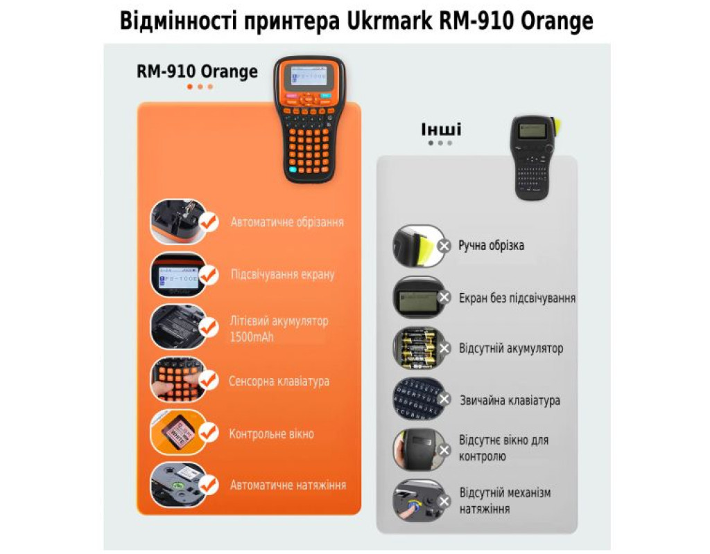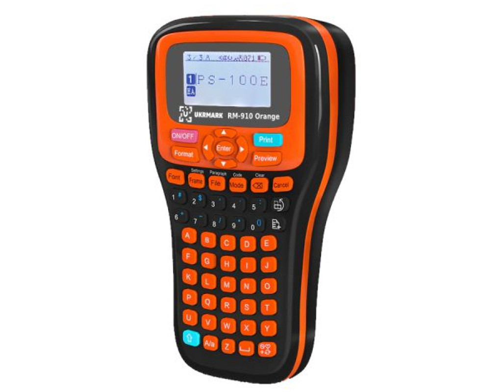 UKRMARK RM-910 Orange - портативный термотрансферный принтер для печати этикеток, QR и штрих-кодов. Работает с оригинальными и совместимыми картриджами UKRMARK и Brother серии TZE. ХАРАКТЕРИСТИКИ Тип принтера: портативный Тип печати: термотрансферный Разрешение печати: 180 DPI Тип экрана: ЖК с подсветкой Печать штрих-кодов: различные типы QR- и штрих-кодов Клавиатура: ABC Языки меню принтера: английский Скорость печати: 15 mm/s Ширина ленты: 3.5 / 6 / 9 / 12 mm Длина ленты: Max. 10 m Резак: автоматический Зеркальная печать: поддерживает Создание этикетки: клавиатура устройства Дизайн полей: 48 вариантов Отступы полей: 20, 10, 4, 2 мм Печать строк: 4 строки Предварительный просмотр этикетки: есть Размеры шрифта: маленький, нормальный, большой Выравнивание текста: по левому краю, по центу, по правому краю Пробелы: узкие, нормальные, широкие Хранит файлов: до 99 Знаков, символов: 200 Расходные материалы: совместим с Brother серии TZE Сферы применения: телеком, офис, медицина, промышленность, общая маркировка Виды маркировки: 4 вида маркировки Сериализация: поддерживает Источники питания: от сети AC 220 V; батарейки типа ААА - 6 шт.; аккумулятор. (батарейки и аккумулятор в комплект не входят) Размеры: 211х121х55 mm Вес: 0,486 kg *Характеристики и комплектация могут быть изменены производителем без дополнительного уведомления