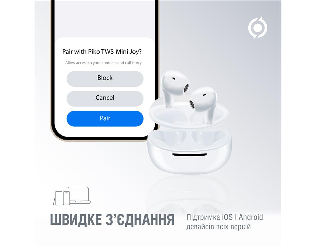 | Окунитесь в мир свободного звука с беспроводными наушниками Piko TWS-MiniJoy! Наслаждайтесь высоким качеством звука без ограничений благодаря технологии беспроводного соединения. Наушники сочетают в себе высокое качество звука с комфортной ноской, гарантируя при этом невероятную звуковую четкость и стабильное подключение к устройству. Удобно регулируйте громкость и переключайте треки благодаря интуитивным кнопкам управления.