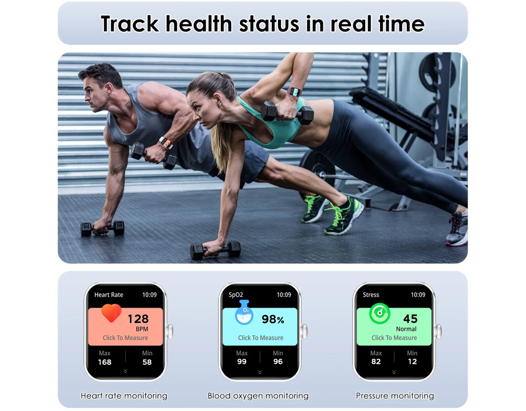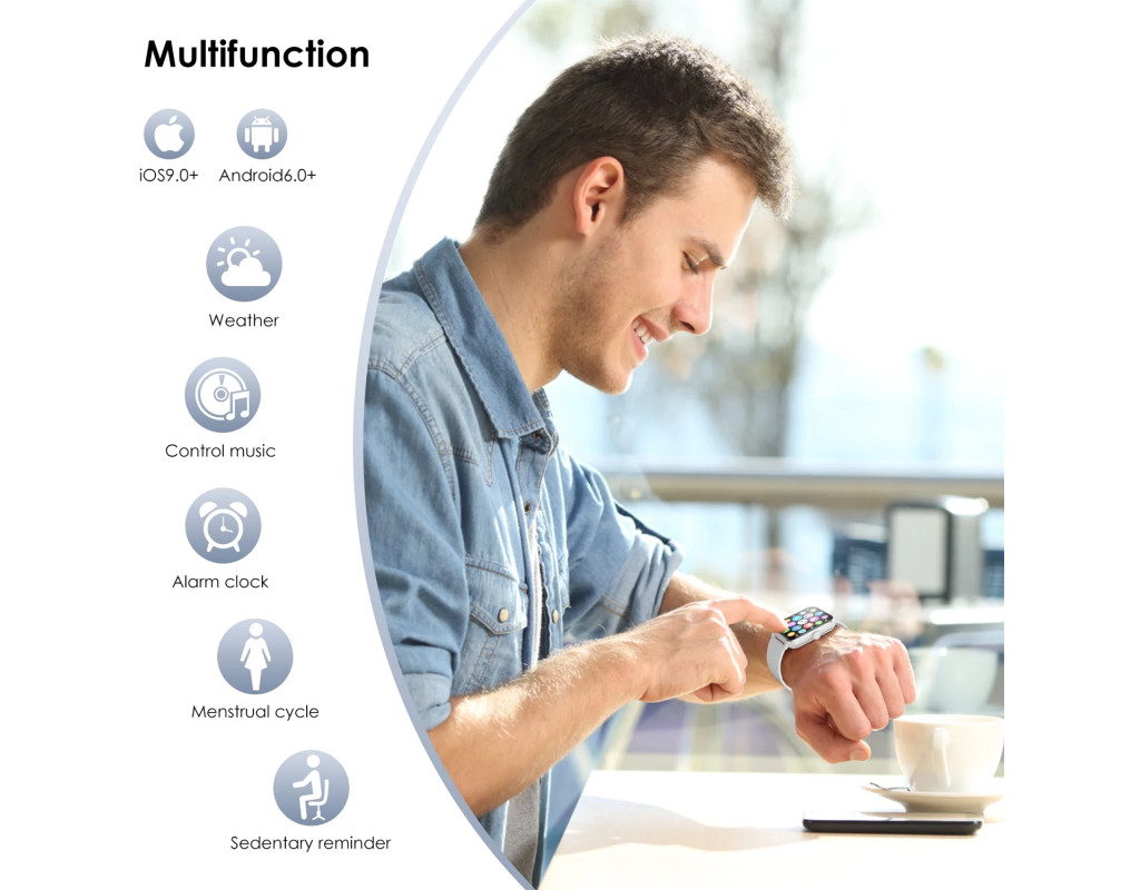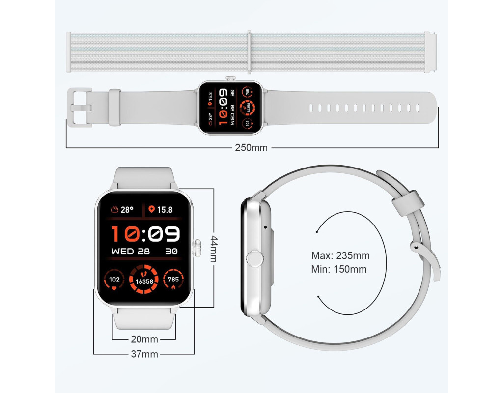 Особливості (Смартгодинники) Акселерометр, 25 спортивних режимів, мікрофон, вібромотор, керування камерою та музикою, регулювання яскравості, захист за стандартам IP68, магнітна зарядка, функція гучного зв'язку, контроль денної активності, трекінг сну, пульсометр, рівень кисню у кров