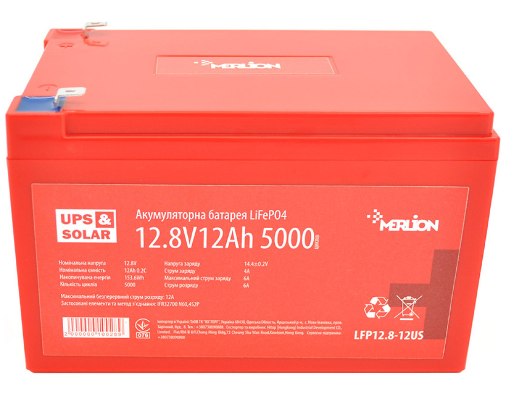 Напряжение - 12.8 В, Ёмкость - 12 Ач, Ток заряда - 6 А, 6 А, 3000 циклів, 150 х 100 х 97 мм, 1.35 кг