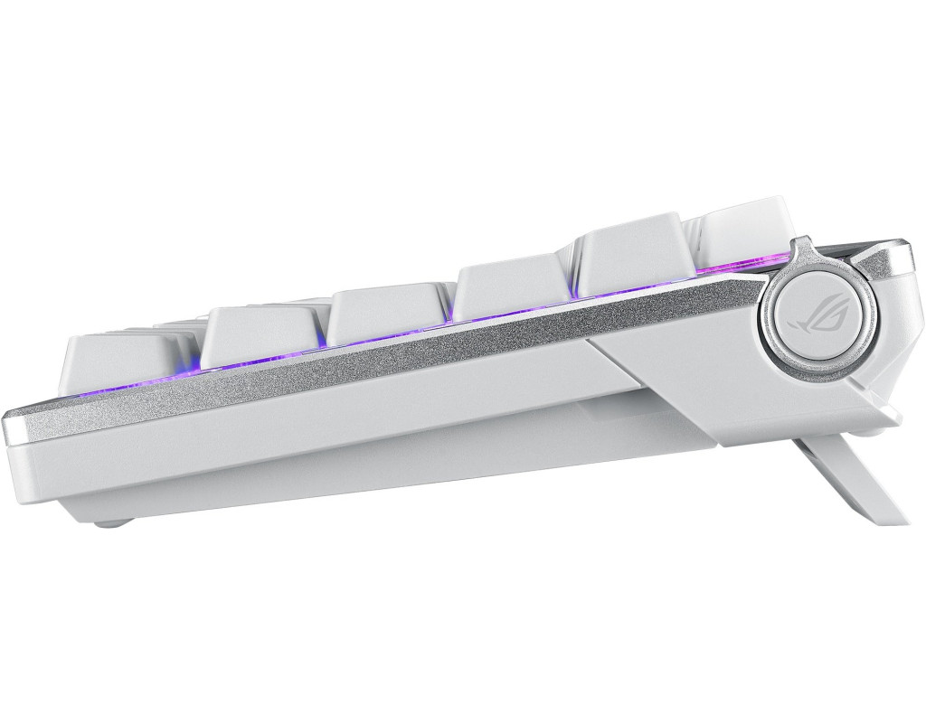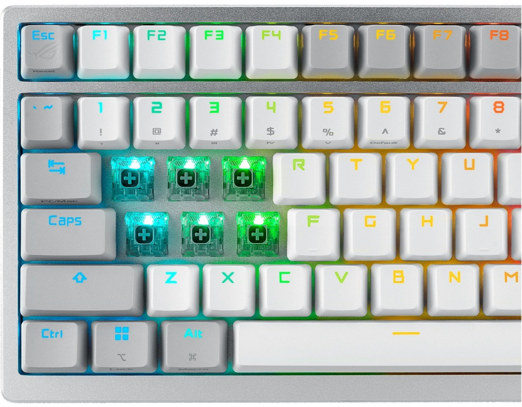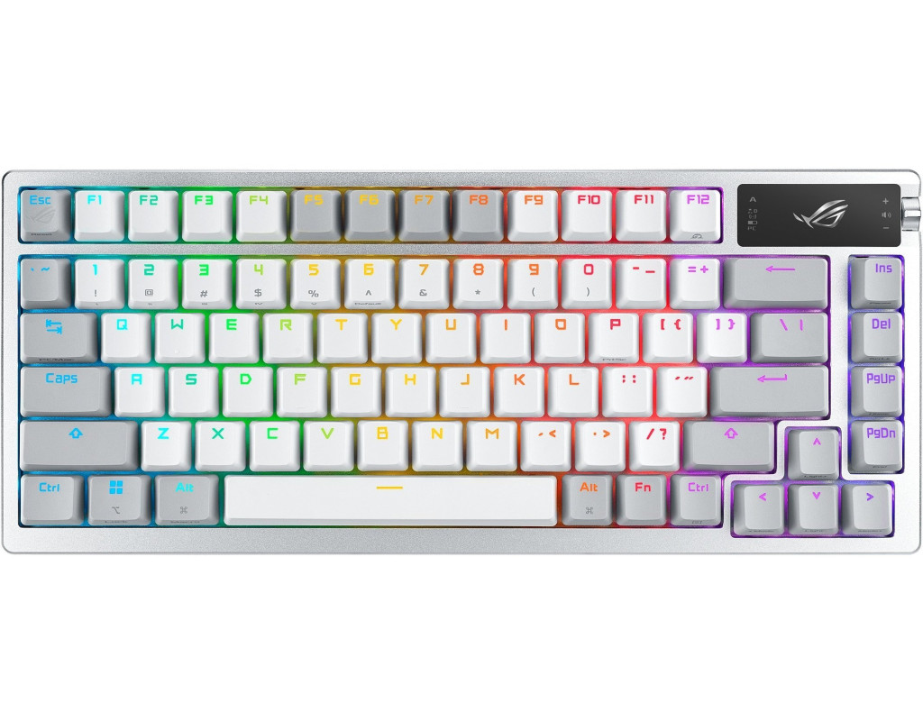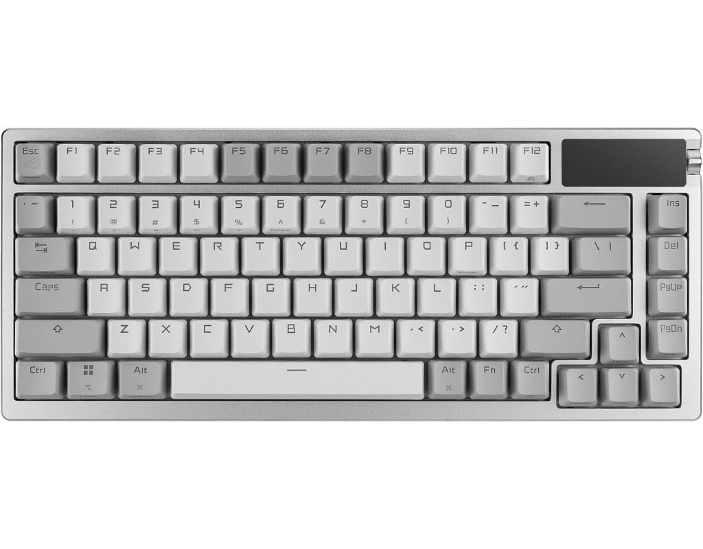 | Геймерская клавиатура ROG Azoth: возможность персонализации, формфактор 75%, упругая прокладка в креплении верхней металлической пластины, три демпфирующих слоя, предварительно смазанные механические переключатели ROG NX с возможностью горячей замены, стабилизаторы клавиш, двухкомпонентные PBT-колпачки, набор для смазки, три режима подключения, технология SpeedNova в режиме 2,4 ГГц, OLED-дисплей, 3-позиционный регулятор, три угла наклона, поддержка Mac.