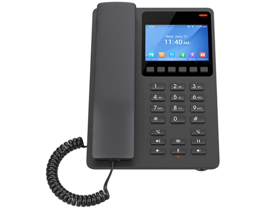 Grandstream GHP631 - компактний готельний телефон з кольоровим РК-дисплеєм, що ідеально підходить для використання в готелях та інших подібних умовах. Серія готельних телефонів GHP включає GHP630/GHP630W та GHP631/GHP631W, прості у використанні IP-телефони для будь-якого готельного номера, які можна програмувати та налаштовувати відповідно до потреб готелів та їхніх гостей. Моделі GHP630W і GHP631W оснащені вбудованим дводіапазонним Wi-Fi 802.11ax 6 для підтримки бездротового розгортання. Ця серія оснащена динаміком HD, 2 обліковими записами/лініями SIP, 6 контекстно-залежними програмними клавішами, 10 клавішами швидкого набору, 3-сторонньою голосовою конференцією, підтримує повнодіапазонний голосовий кодек OPUS і забезпечує розширений алгоритм стійкості до тремтіння, який допускає до 30% втрати пакетів без впливу на якість голосу. Серія GHP підтримується системою управління пристроями Grandstream (GDMS), яка забезпечує централізований інтерфейс для налаштування, надання, керування та моніторингу розгортання кінцевих точок Grandstream. IP-телефони серії GHP можна встановлювати на робочому столі або кріпити на стіні та отримувати живлення від PoE, адаптера живлення (GHP630W/GHP631W) і зарядного порту USB Type-C. Завдяки елегантному та компактному дизайну GHP630/GHP630W та GHP631/GHP631W ідеально підходять для готелів, квартир, гуртожитків, лікарень, роздрібних магазинів тощо. Технічні характеристики: Протоколи/стандарти | SIP: SIP RFC3261, TCP/IP/UDP, RTP/RTCP, RTCP-XR, TLS, SRTP Мережа: IPv4, IPv6, HTTP/HTTPS, ARP, ICMP, DNS (A-запис, SRV, NAPTR), DHCP, SSH, TFTP, NTP, STUN, LLDP, TR-069, 802.1x | Графічний дисплей | Кольоровий РК-дисплей високої роздільної здатності діагоналлю 3,5" (480 x 320) | Мережеві інтерфейси | Один роз'єм Ethernet 10/100 Мбіт/с з функцією автоузгодження та вбудованим модулем PoE класу 2 | Wi-Fi | Вбудований дводіапазонний модуль Wi-Fi 802.11 a/b/g/n/ac/ax (2,4 та 5 ГГц) (моделі GHP630W/GHP631W) | Основні кнопки | 26 кнопок, включаючи: 6 контекстно-залежних програмованих кнопок; 12 стандартних кнопок із цифрами (0−9: кнопки швидкого набору з налаштуванням у веб-інтерфейсі, *, #); 5 спеціальних кнопок (Flash, повторний набір, гучний зв'язок, автовідповідач, утримання); 3 кнопки регулювання гучності: збільшити, зменшити, вимк. мікрофон (з червоним світлодіодним індикатором) | HD-аудіо | Одна HD-трубка з широкосмуговим звуком | Аудіо-конференц-зв'язок | 2 SIP-акаунти та 2 лінії, конференції до 3 учасників | Голосові кодеки та можливості | Підтримка G.729A/B, G.711µ/a-law, G.726, G.722 (широкополосний), G.723, iLBC, повнодіапазонного Opus, внутрішньо- та позасмугового DTMF (в аудіосигналі, RFC2833, SIP INFO), VAD, AEC, CNG, PLC, AGC, AJB | Функції телефонії | Набір, відповідь, повторний набір, скидання, гучний зв'язок, голосова пошта (з сервером), переклад, конференція, утримання/зняття з утримання, відключення та увімкнення мікрофона, гнучке налаштування абонентських груп, перемикання на резервний сервер при відмові під час швидкого набору | Додаткові можливості | Підтримка багатоадресного пейджингу та служби E911 Підтримка відкриття дверей через GDS Підтримка передового алгоритму стійкості до джиттера | USB | Роз'єм USB Type-C для заряджання зовнішніх пристроїв (макс. 500 мА) | Монтаж на стіну | Одне настінне кріплення | Якість обслуговування | Рівень 2 (802.1Q, 802.1p) та рівень 3 (ToS, DiffServ, MPLS) | Безпека | Безпечне завантаження, випадковий пароль за замовчуванням, унікальний сертифікат безпеки на кожен пристрій, паролі для адміністраторів, файл конфігурації з 256-бітовим AES-шифруванням, SRTP, TLS, ке
