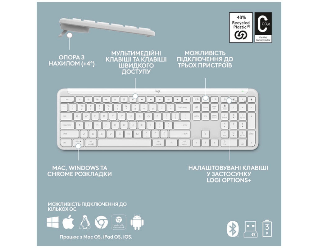 | Клавиатура Logitech K950 Bluetooth/Wireless UA Off-White (920-012466) — это идеальный выбор для тех, кто ценит качество, удобство и современные технологии. Мультимедийная клавиатура предназначена специально для работы с ПК и выполнена с использованием мембранной конструкции, что обеспечивает тихую и комфортную работу. Беспроводное подключение обеспечивается с помощью USB адаптера 2.4 ГГц или технологии Bluetooth, что дает возможность выбрать наиболее удобный для вас способ подключения. Полноразмерная раскладка клавиатуры содержит как английские, так и украинские символы, что делает её идеальной для двуязычных пользователей и подходит для любых задач — от офисной работы до программирования или игр. Одной из ключевых особенностей этой модели является индикатор уровня заряда, который позволяет своевременно узнать о необходимости зарядки. Эта особенность особенно важна для тех, кто ценит непрерывность рабочего процесса и не желает быть привязанным к розетке. Клавиатура Logitech K950 также отличается широкой совместимостью с различными операционными системами, включая Chrome OS, Windows, Linux и Mac OS. Это делает её универсальным решением для пользователей, работающих на разных платформах и ценящих гибкость в выборе программного обеспечения. Стильный офф-вайт цвет придаёт устройству изысканный вид, который легко дополнит любой интерьер, от домашнего кабинета до современного офиса. Logitech K950 не только обеспечивает высокий уровень функциональности, но и становится частью вашего личного стиля, улучшая впечатления от использования новейших технологий. С этим аксессуаром вам больше не нужно выбирать между качеством, удобством и стилем. Приобретая Logitech K950, вы получаете инновационное устройство, разработанное для легкости в использовании и обеспечения максимального комфорта во время работы или развлечений. |