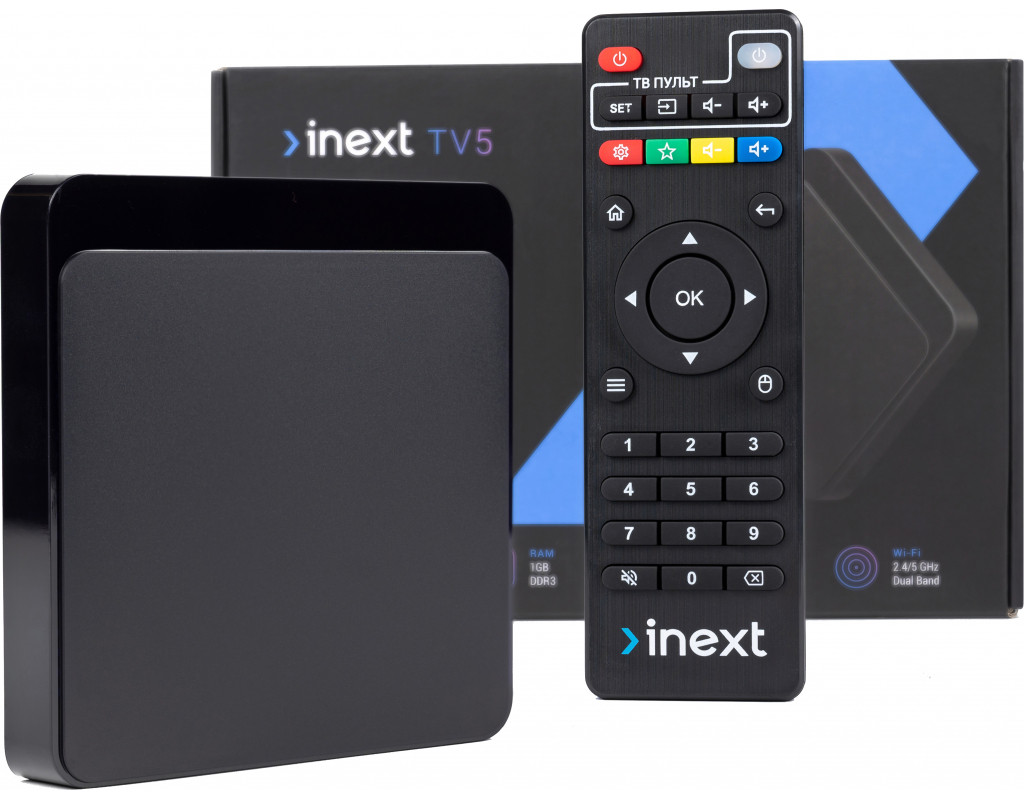 Двухдиапазонный WiFi модуль Более высокую скорость передачи информации и стабильный сигнал обеспечивает встроенный двухдиапазонный модуль WiFi. Благодаря Wi-Fi 2.4/5 GHz вы сможете быстро, без задержек и подвисаний, просматривать потоковые видео с разрешением 4K, не заполняя комнату лишними проводами. Все что необходимо для подключения inext TV5 – интернет.