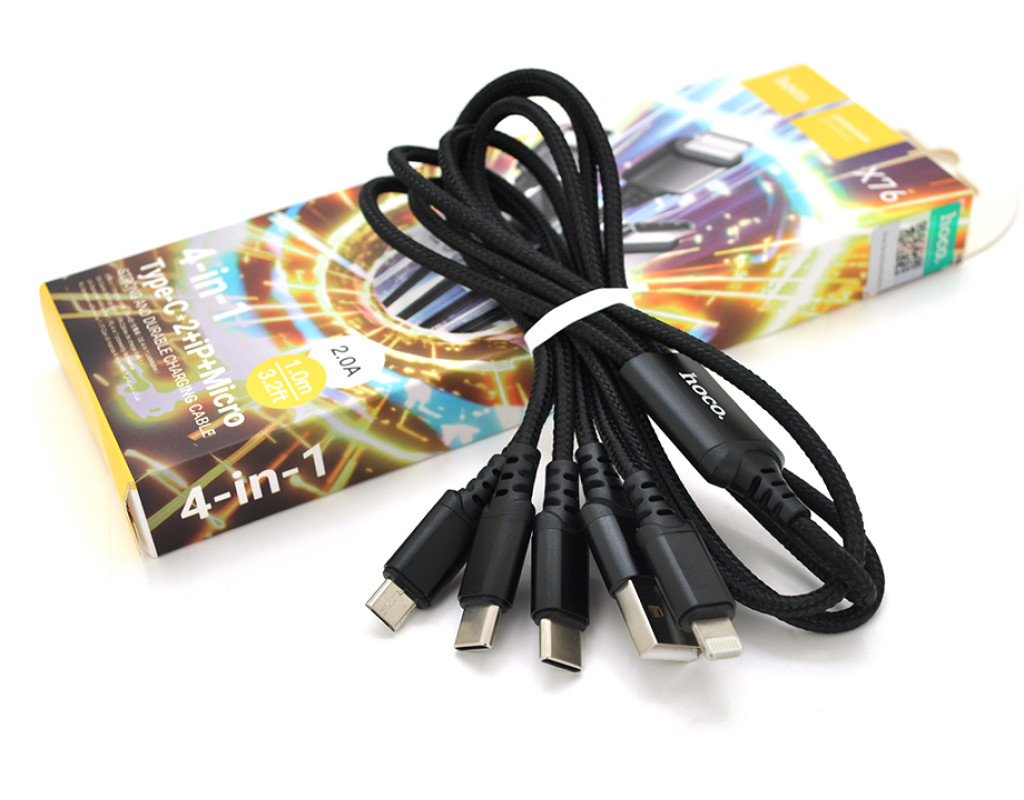 | Кабель HOCO X76 USB-1 4 в 1 Micro / Iphone / 2*Type-C, 2A, довжина 1м, чорний, коробка Характеристики: - Тип: кабель - Модель: HOCO X76 USB-1 - Функціональність: 4 в 1 (Micro / Iphone / 2*Type-C) - Сила струму: 2A - Довжина: 1 метр - Колір чорний - Упаковка: коробка |
