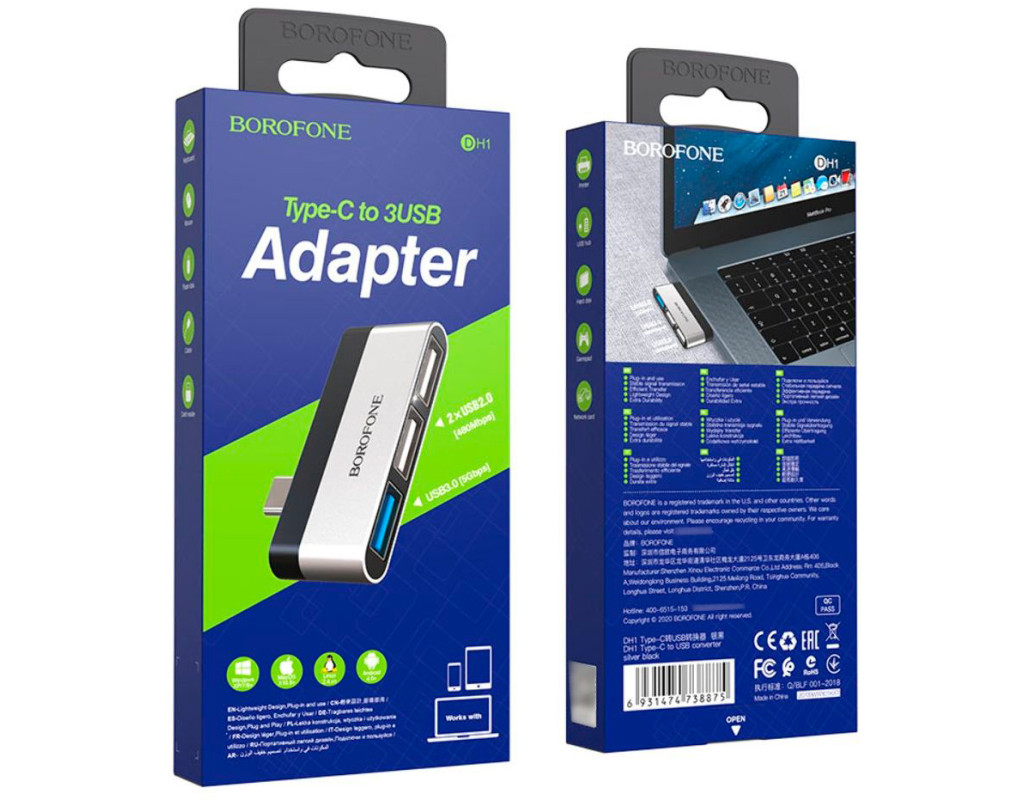 | Опис: Перехідник BOROFONE DH1 Type-C(Male) - USB3.0+2*USB2.0, чорний, упаковка. Характеристики: - Тип роз`єму: Type-C(Male) - Порти: USB3.0 + 2* USB2.0 - Колір чорний - Упаковка: коробка |