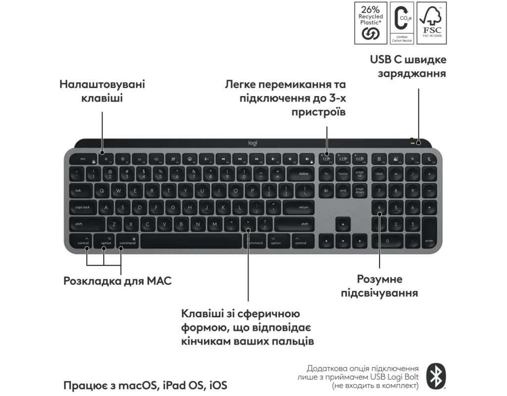 | Клавиатура Logitech MX Keys S для Mac – это совершенство, сочетающее классический дизайн и передовые технологии, созданные для повышения вашей продуктивности. Она оснащена мембранной конструкцией, которая обеспечивает естественное, плавное и точное нажатие клавиш, гарантируя комфорт и эффективность в работе. Особенностью этой клавиатуры является подсветка клавиш, которая автоматически включается благодаря встроенным датчикам движения. Интенсивность подсветки может регулироваться как вручную, так и автоматически, адаптируясь к условиям внешнего освещения. Это обеспечивает комфорт даже в темноте, сохраняя заряд до 10 дней при полной зарядке или до 5 месяцев с выключенной подсветкой. MX Keys S создана для тех, кто ценит внимание к деталям. Клавиши имеют сферические углубления, идеально повторяющие форму пальцев, и округленные края для четкого нажатия с любой точки. Благодаря матовому покрытию пальцы легко скользят во время работы, уменьшая шум и повышая продуктивность. Эта клавиатура поддерживает беспроводное подключение через Bluetooth, позволяя избежать путаницы проводов, оставляя ваше рабочее пространство чистым и аккуратным. Работайте на нескольких устройствах одновременно с помощью технологии Logitech Flow, которая упрощает переключение между Mac OS и iOS. Благодаря цельнометаллической основе, она обеспечивает стабильность на столе, делая процесс ввода текста еще более приятным и тихим. Подключайте и заряжайте клавиатуру с помощью кабеля USB-C, не отказываясь от скорости и удобства во время работы. |