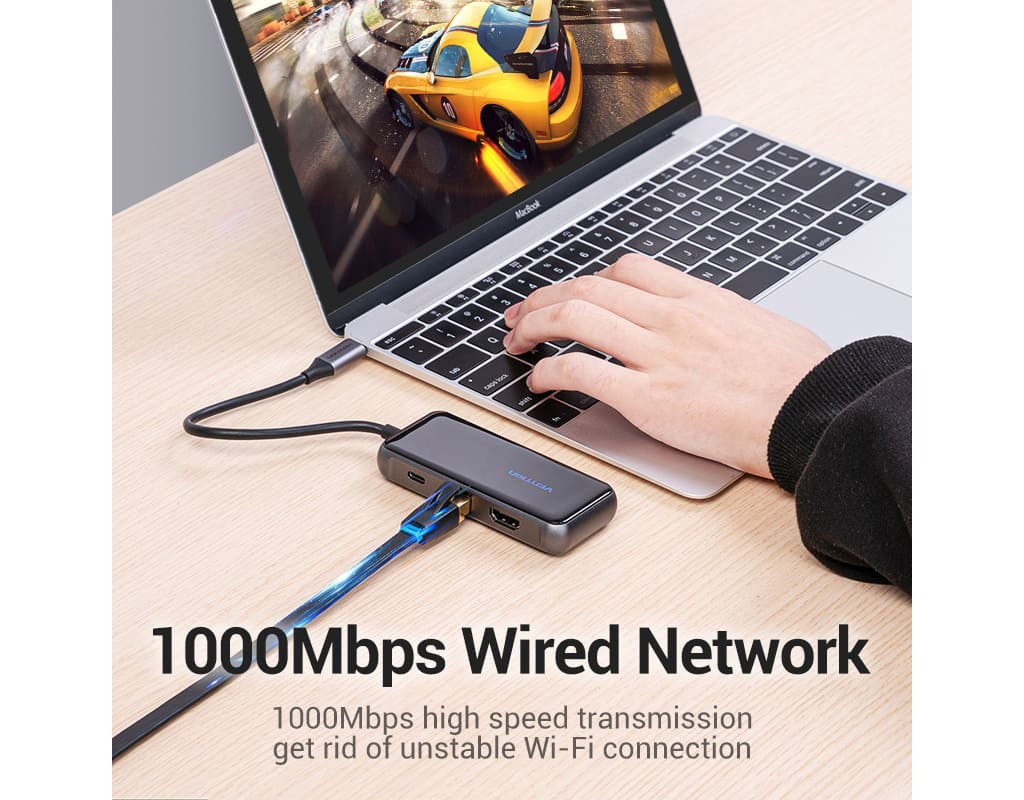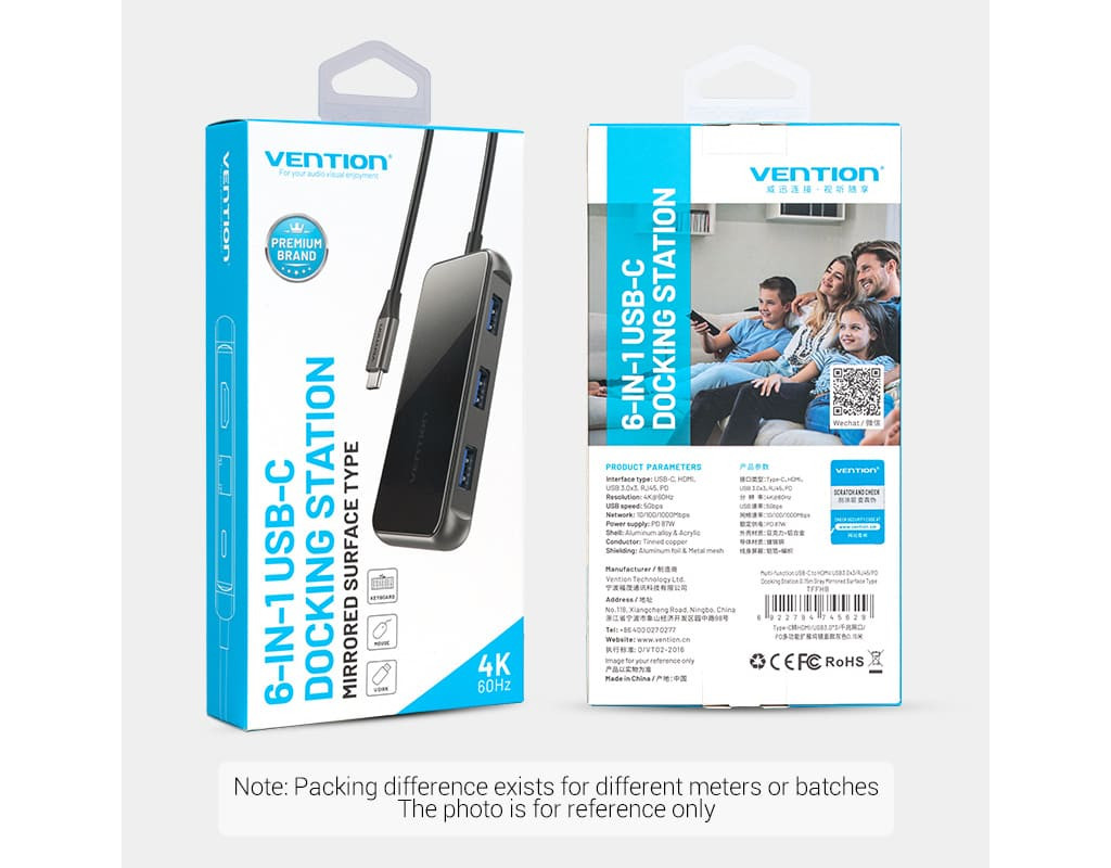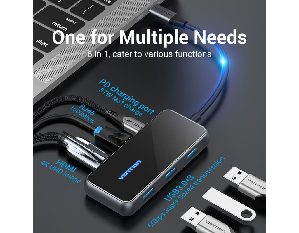 Концентратор VENTION USB 3.1 Type-C to HDMI 4K60Hz/USB 3.0х3/RJ45/PD 87W 6-in-1 Mirrored Surface (TFFHB)