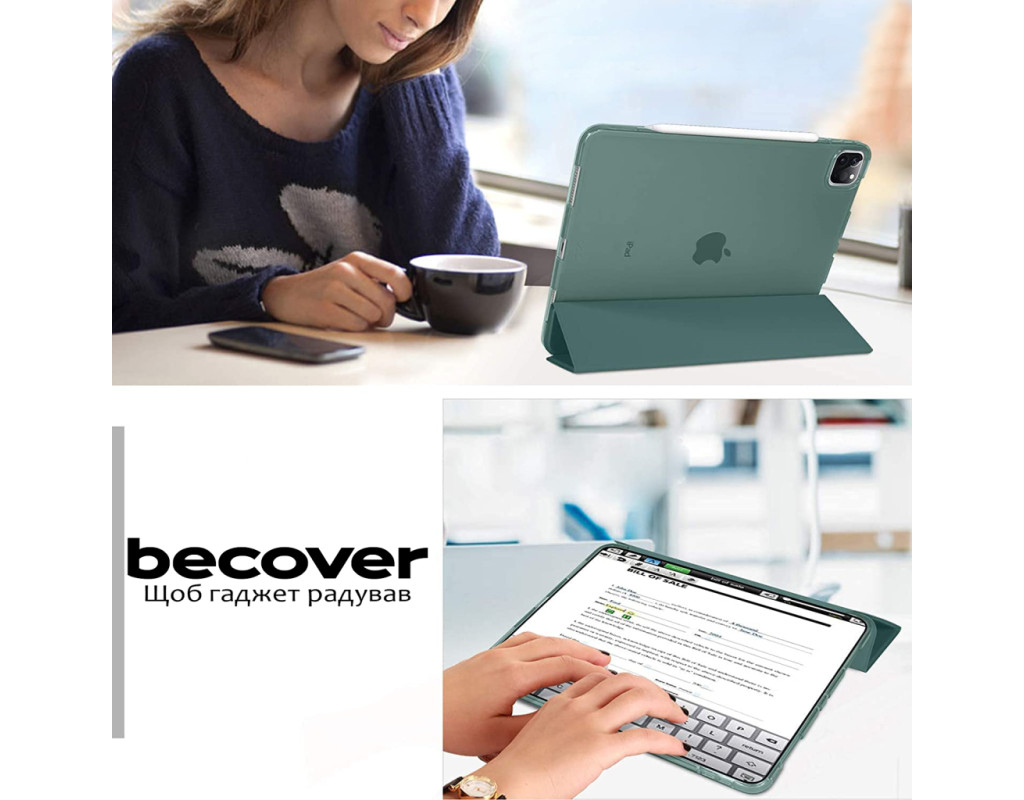 "Чехол-книга Tri Fold Hard BeCover, изготовлен из качественной искусственной кожи, задняя крышка из полупрозрачного пластика. Оснащен стойкой подставкой: передняя крышка с двойным положением легко превращается в подставку для максимально комфортного набора текста на клавиатуре, просмотра видео и видеозвонков. Если вы используете планшет для работы, этот аксессуар будет верным помощником." |
