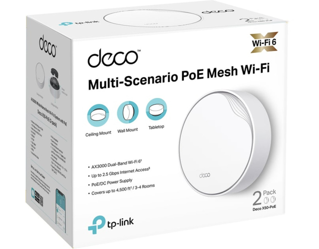 Несколько вариантов установки – разместите его на столе или установите на потолке или стене с помощью адаптивных аксессуаров. Поддерживается PoE – Питание через Ethernet для упрощенного развертывания сети. Проводная сеть Multi-Gig 2,5 Гбит/с – 1х Порт 2,5 Гбит/с + 1х Гигабитный порт. Бесшовная Mesh сеть на основе искусственного интеллекта – Интеллектуально изучает вашу сетевую среду, чтобы обеспечить идеальный Wi-Fi, уникальный для вашего дома. TP-Link HomeShield – обеспечивает полную защиту сети, надежный родительский контроль и безопасность IoT приборов в реальном времени. Универсальная совместимость – обратная совместимость со всеми поколениями Wi-Fi и работает с любым поставщиком услуг Интернета (ISP) и модемом. Настройка проще, чем когда-либо – Программа Deco шаг за шагом проведет вас через настройки. |