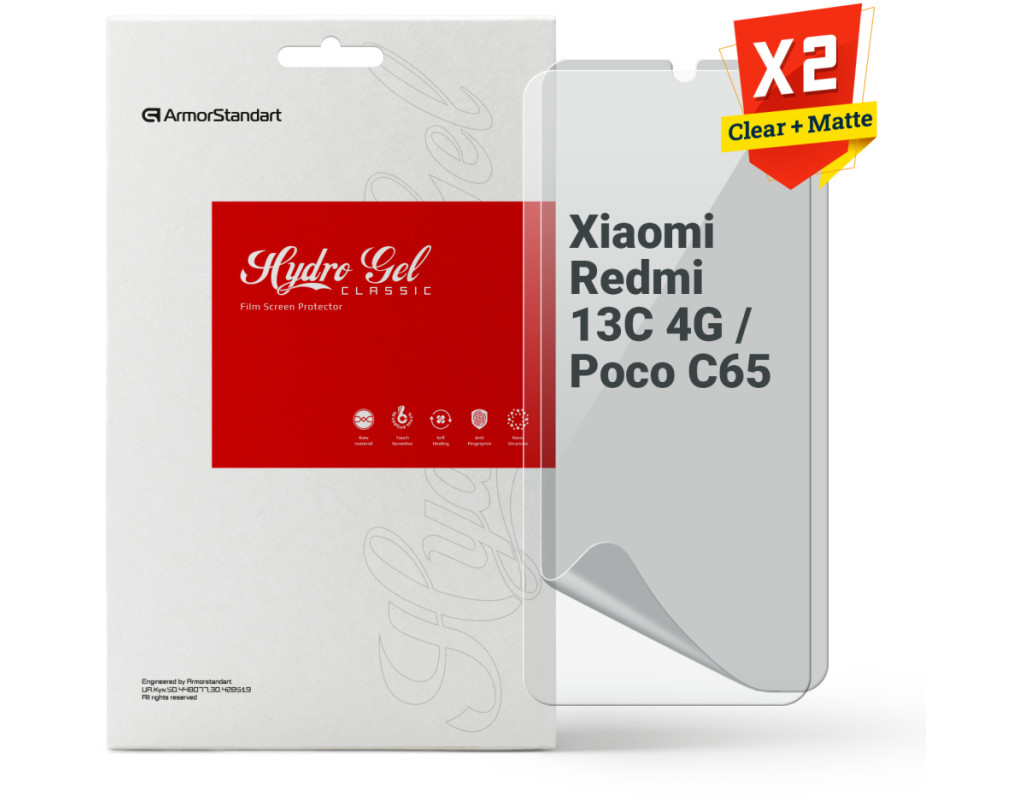 Назначение - для телефона, Вид покрытия - матовое, защитное, гидрогелевая, Совместимость с моделями - Xiaomi Redmi 13C, Xiaomi Poco C65, Количество в упаковке - 2 шт