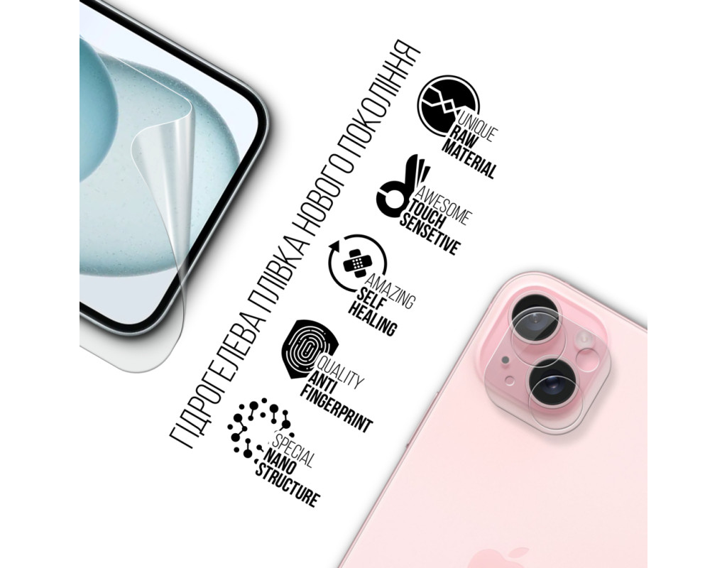 Назначение - для телефона, Вид покрытия - глянцевое, матовое, защитное, гидрогелевая, Совместимость с моделями - Apple iPhone 15 Plus, Особенности - + пленка для блока камер, Количество в упаковке - 2 шт