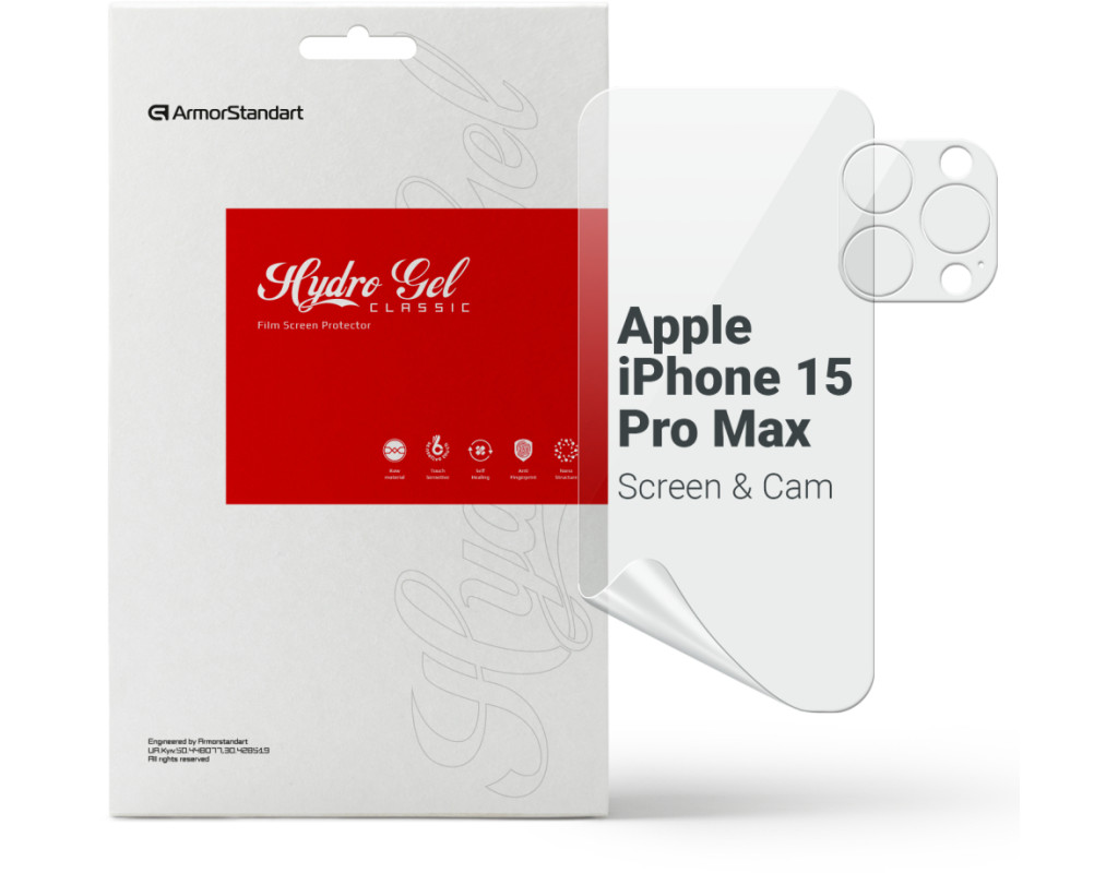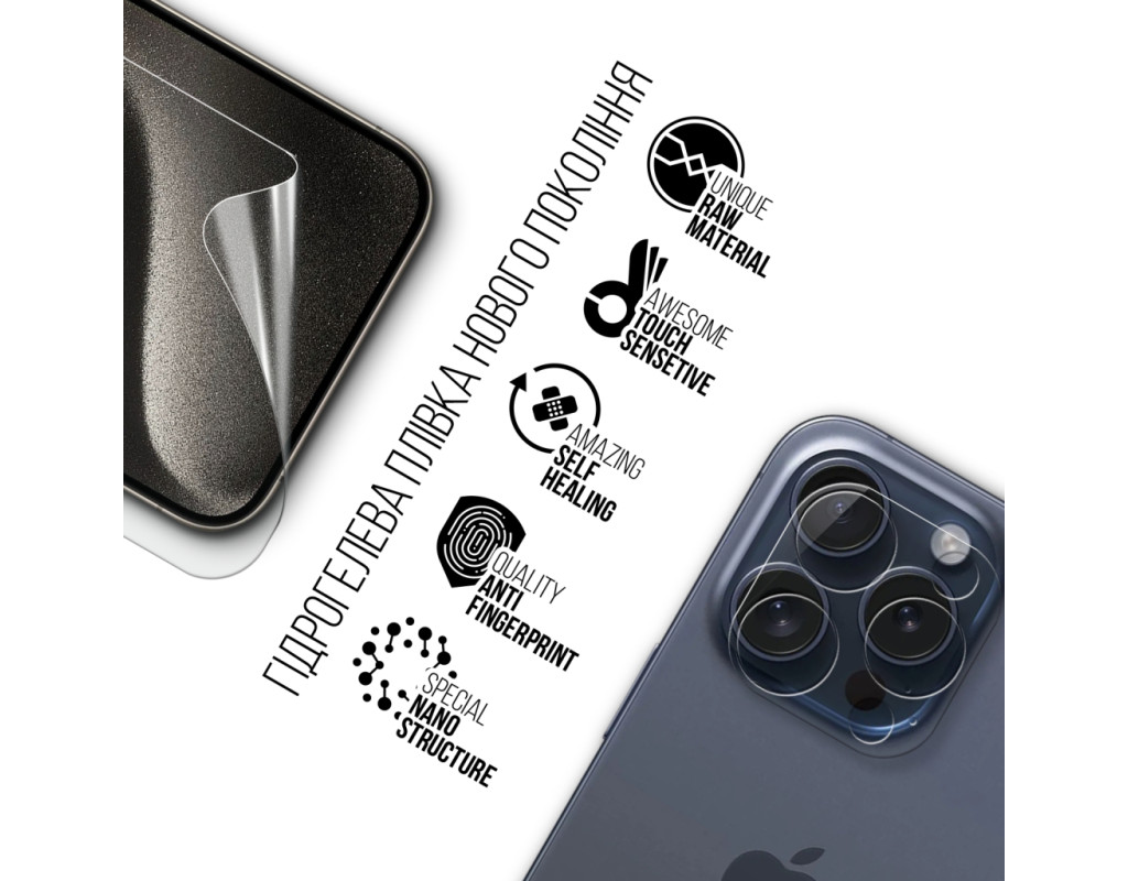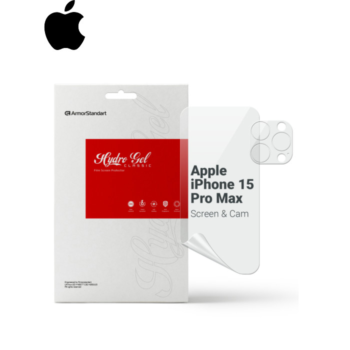 Назначение - для телефона, Вид покрытия - защитное, гидрогелевая, Совместимость с моделями - Apple iPhone 15 Pro Max, Особенности - + пленка для блока камер, Количество в упаковке - 1 шт