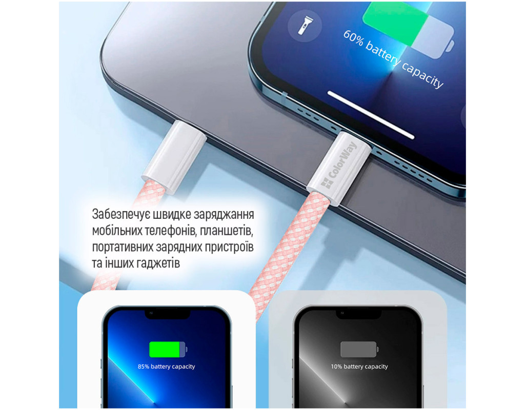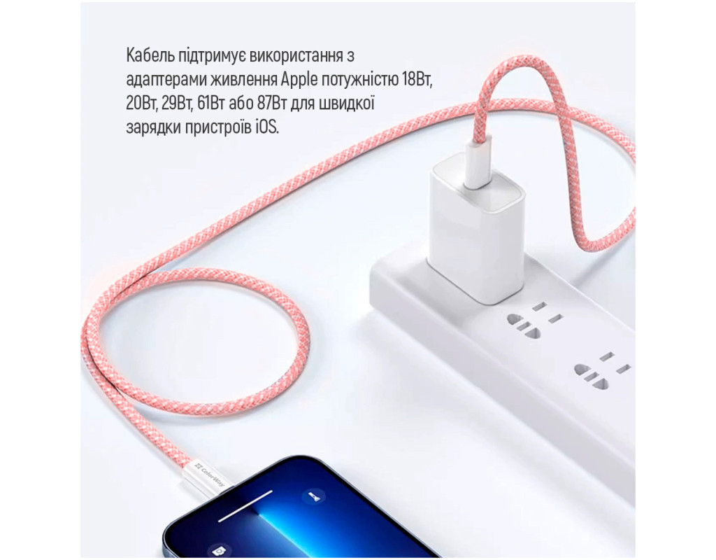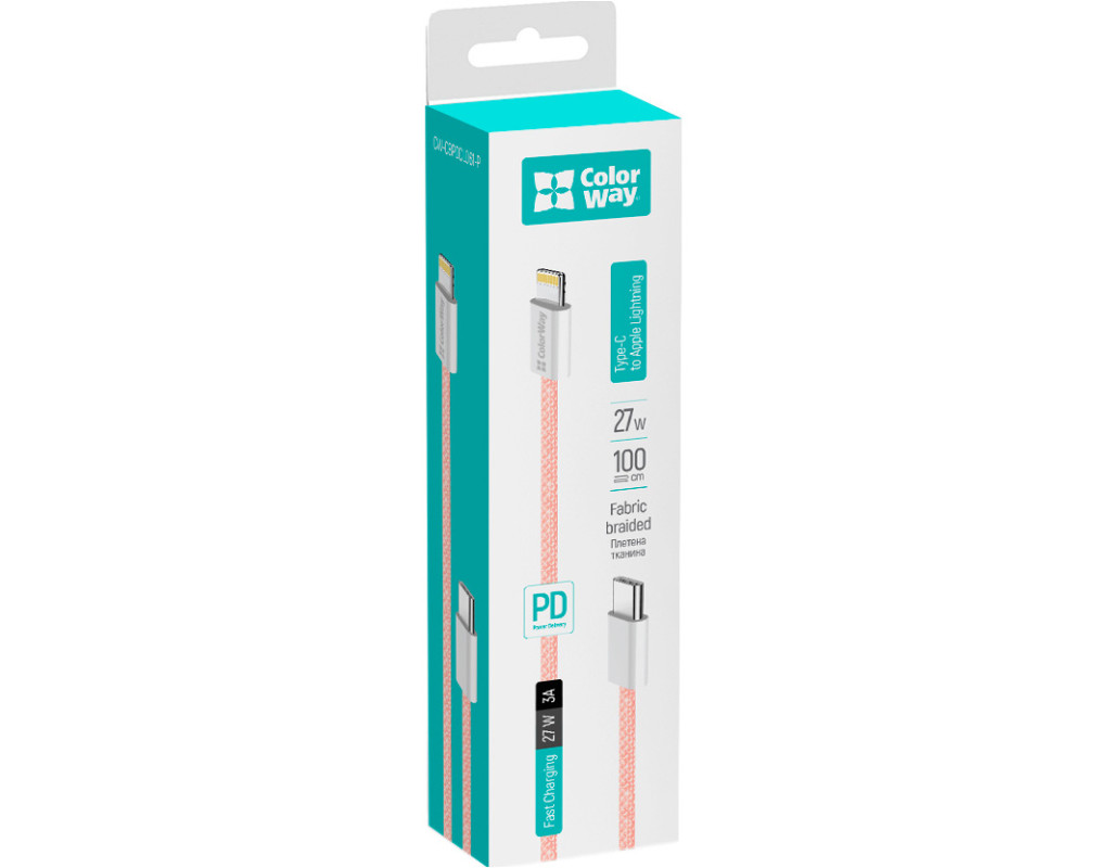 Кабель синхронизации ColorWay Apple USB-C to Lightning (27W) – это высокотехнологичный и надежный аксессуар для удобной синхронизации Apple-устройств. Он позволяет подключать iPhone, iPad или iPod с разъемом Lightning к порту USB-C на MacBook или Thunderbolt 3 (USB-C) на MacBook Pro. Кабель поддерживает использование с адаптерами питания Apple мощностью 18Вт, 20Вт, 29Вт, 61Вт или 87Вт для быстрой зарядки устройств iOS. Использование Apple USB-C to Lightning позволяет использовать функцию быстрой зарядки для iPhone 8 и более новых моделей iPhone, а также некоторых моделей iPad Pro. Прочный кабель с уникальным плетением защищает его от износа и изломов при длительном использовании. Длина кабеля 1 метр делает синхронизацию удобной. Высококачественные материалы обеспечивают долговечность кабеля. Выбор цветов (черный, синий, зеленый, серый, розовый, фиолетовый) позволяет подобрать кабель, идеально подходящий для вашего устройства. Особенности
