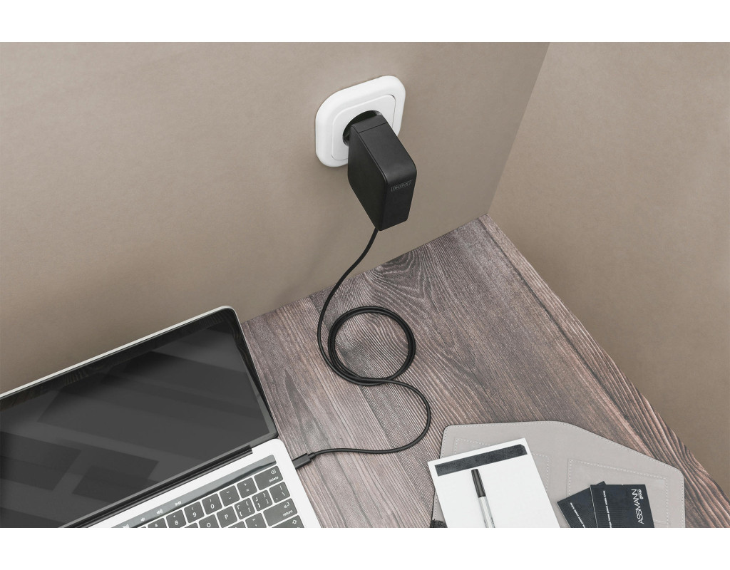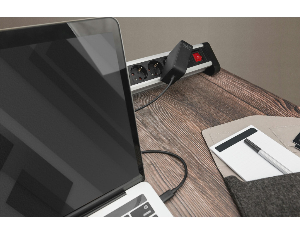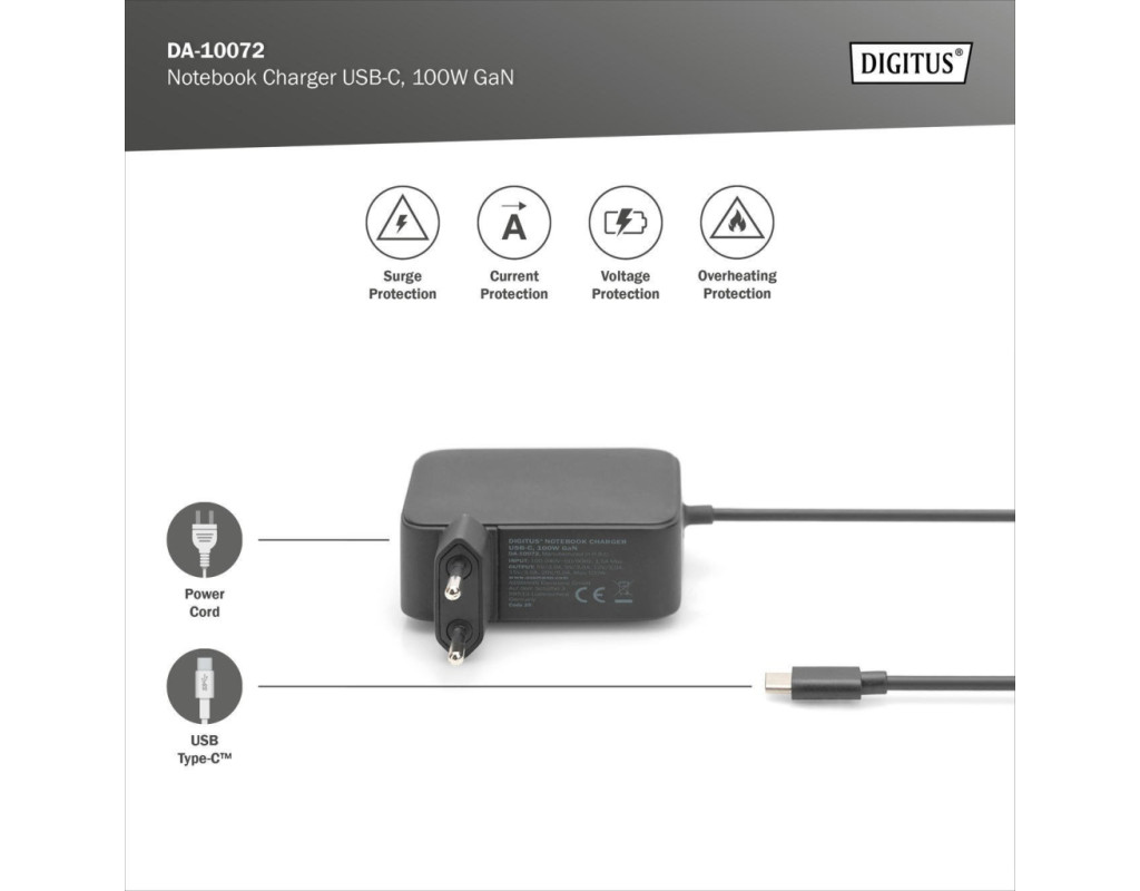 Зарядное устройство для ноутбука DIGITUS с разъемом USB-C и технологией GaN мощностью 100 Вт — мощное, компактное и легкое. Оно совместимо с большинством моделей ноутбуков и многими другими устройствами с интерфейсом USB-C и идеально подходит в качестве второго источника питания в офисе, в путешествии или дома. Благодаря технологии GaN зарядное устройство чрезвычайно эффективно и заряжает ваши устройства быстрее, чем обычные зарядные устройства. Кроме того, оно оснащено интеллектуальной системой защиты, которая предотвращает перегрев, перезарядку и короткое замыкание, тем самым защищая ваши устройства. Особенности: