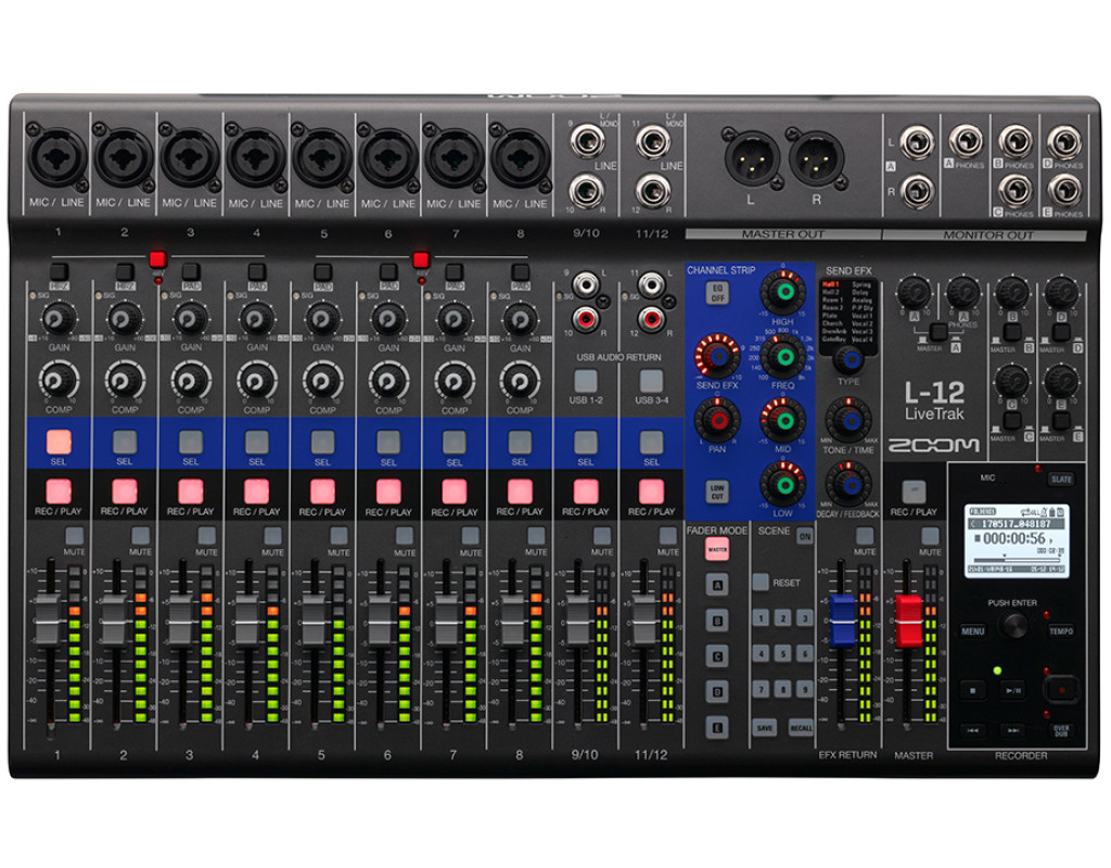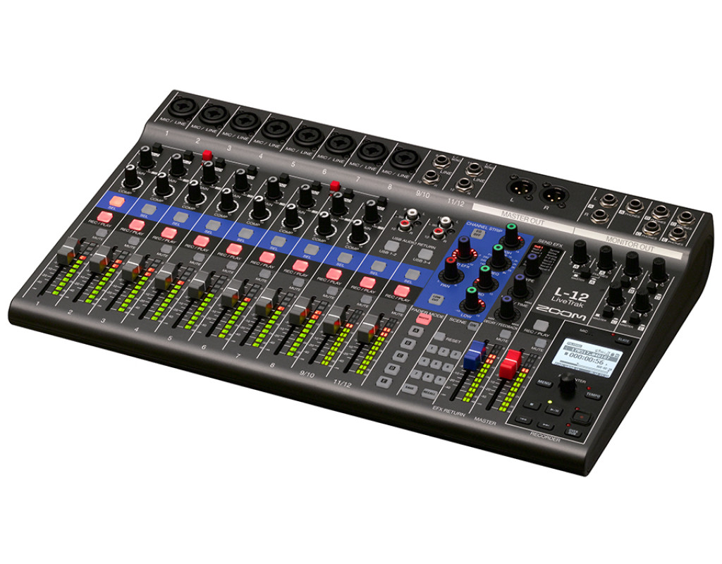 Zoom LiveTrak L-12 — многофункциональная цифровая консоль для микширования, звукозаписи, мониторинга, воспроизведения и ремикширования. LiveTrak позволит вам записывать аудио на 12 дискретных дорожек в качестве до 24 бит/96 кГц WAV на SD-карту и одновременно микшировать ваше живое выступление. Дорожки записываются без применения эквалайзера и эффектов, так что вы сможете перенести их на вашу виртуальную студию звукозаписи (DAW) для дальнейшего микширования и монтажа. Каждый из пяти мониторных выходов LiveTrak позволяет создать уникальный микс, благодаря чему каждый исполнитель может создать и сохранить микс, созданный в соответствии со своими личными предпочтениями. Комплект поставки: - Сетевой адаптер (AD-19)